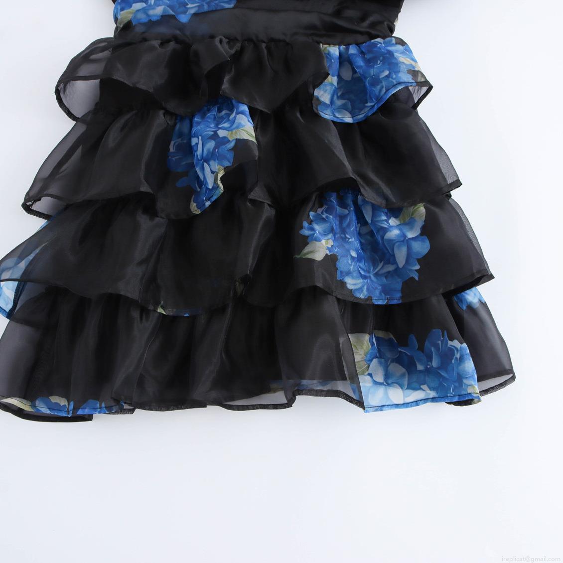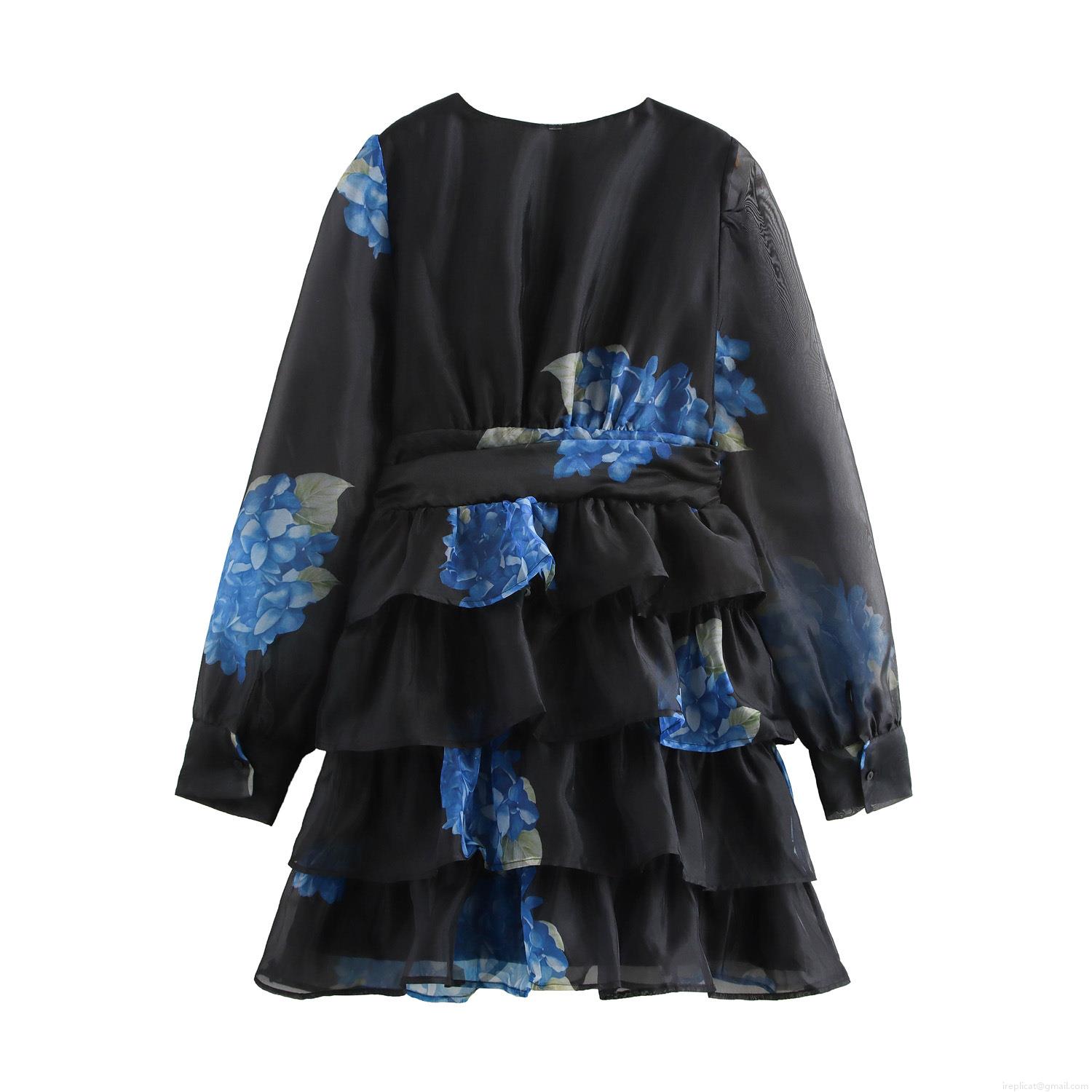 • Women's French Elegant V-Neck Long Sleeve Floral Organza Mini Dress Ruffled Layered High Waist Black Blue Flower Print Chiffon A-Line Short Dress For Party Vacation
