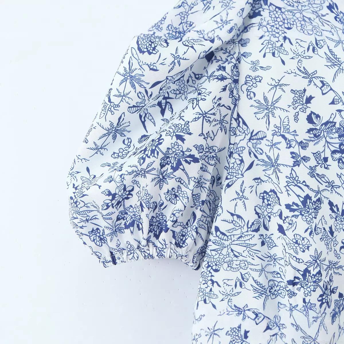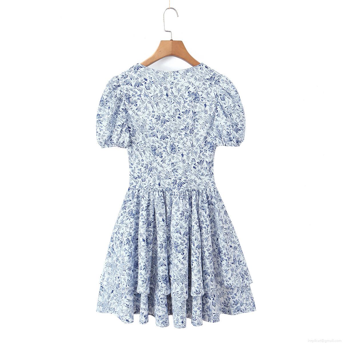 Floral Pattern, Ruffles, Plants And Flowers, V-neck, Gathering, Puff Sleeves, Invisible Zipper, Cake Skirt