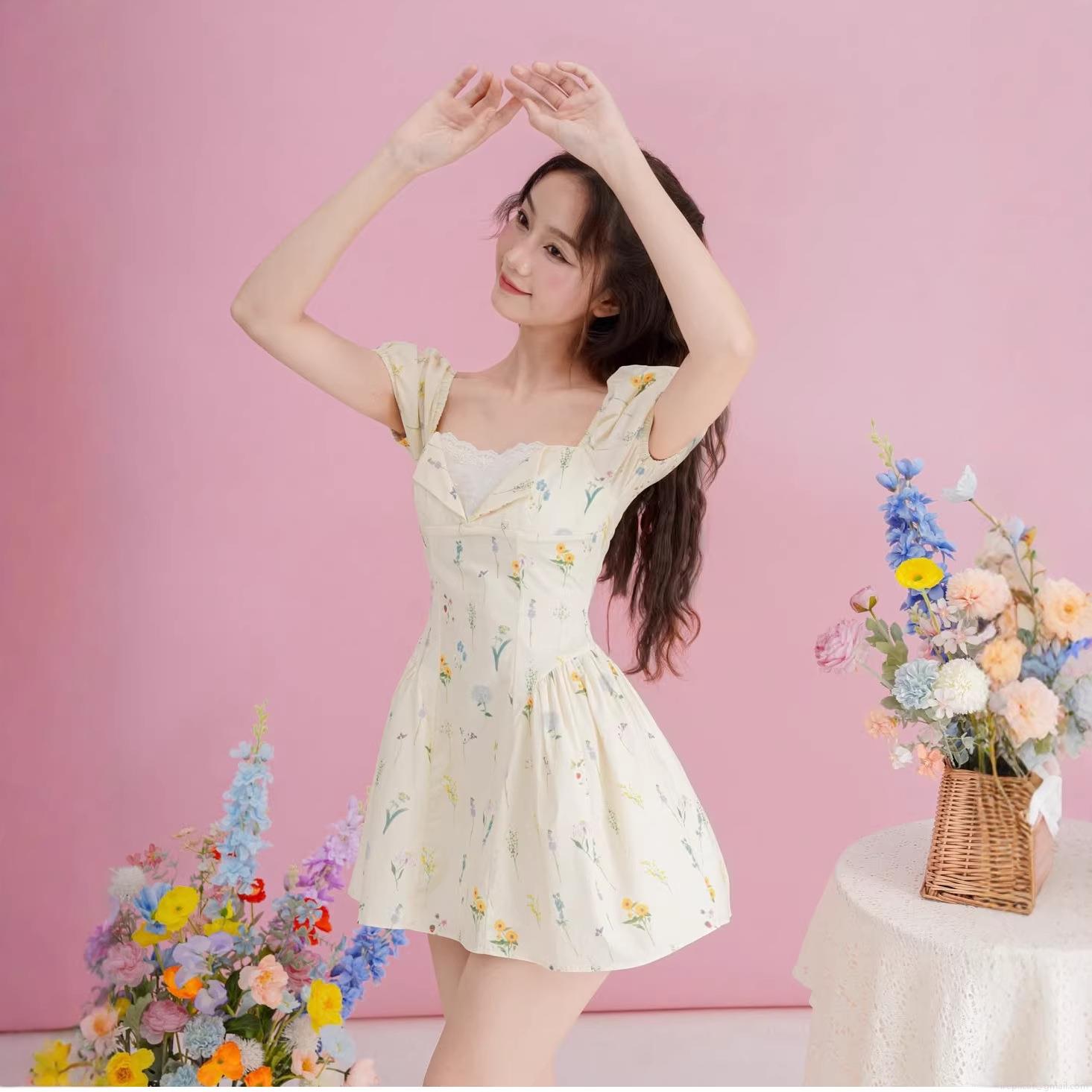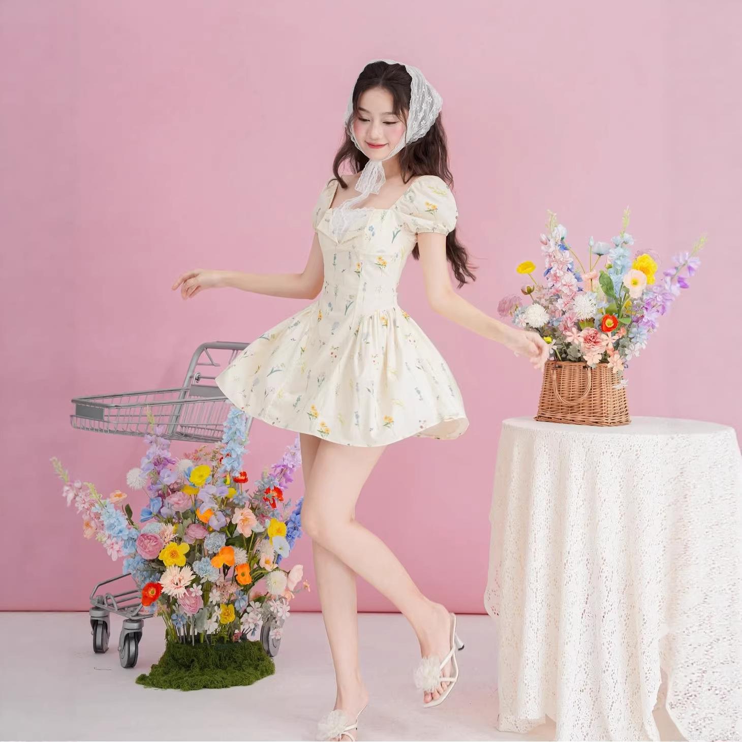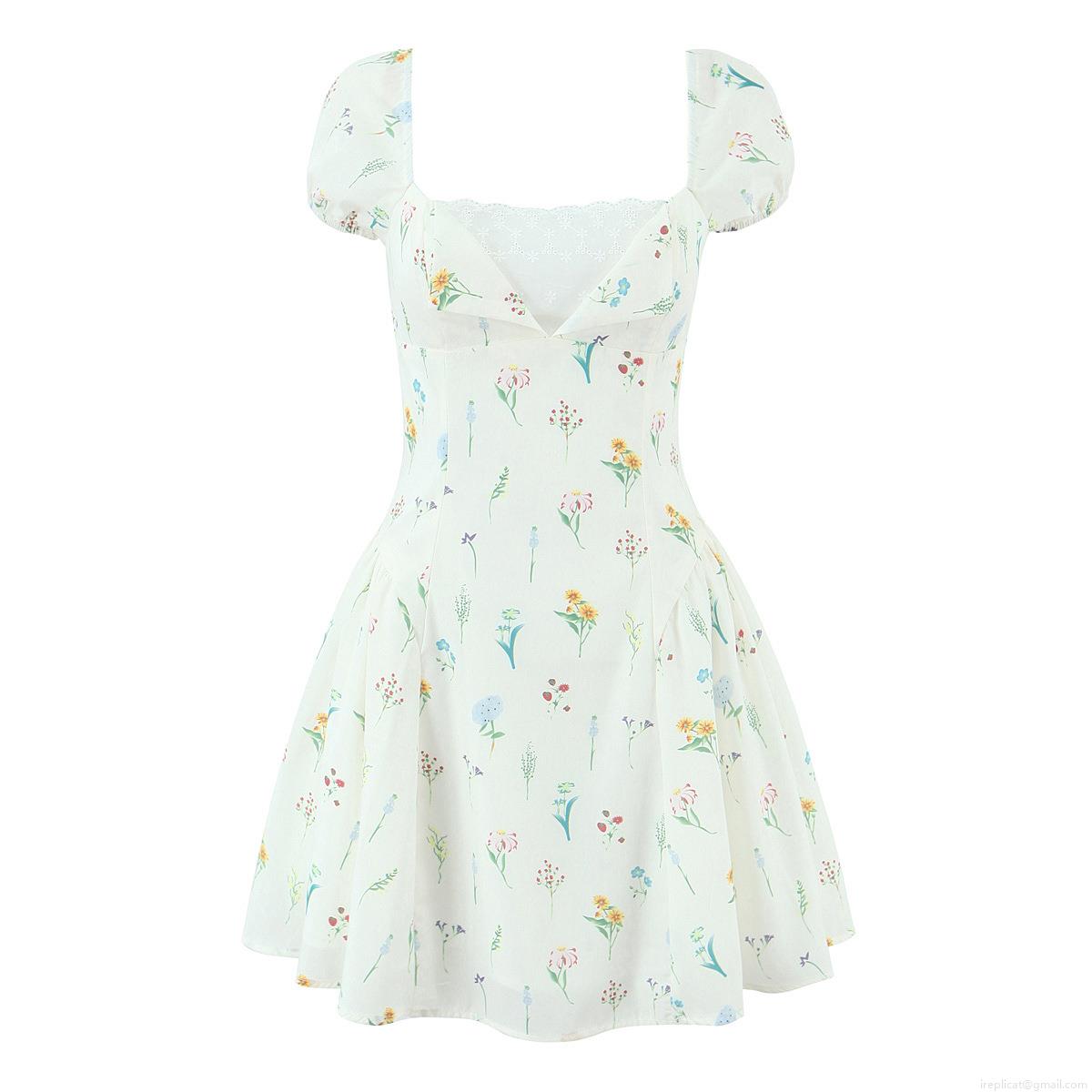 • Women's French Pastoral Floral Puff Sleeve Mini Dress Lace Patchwork Square Neck Slimming High Waist Sweet Polyester Short Dress For Summer