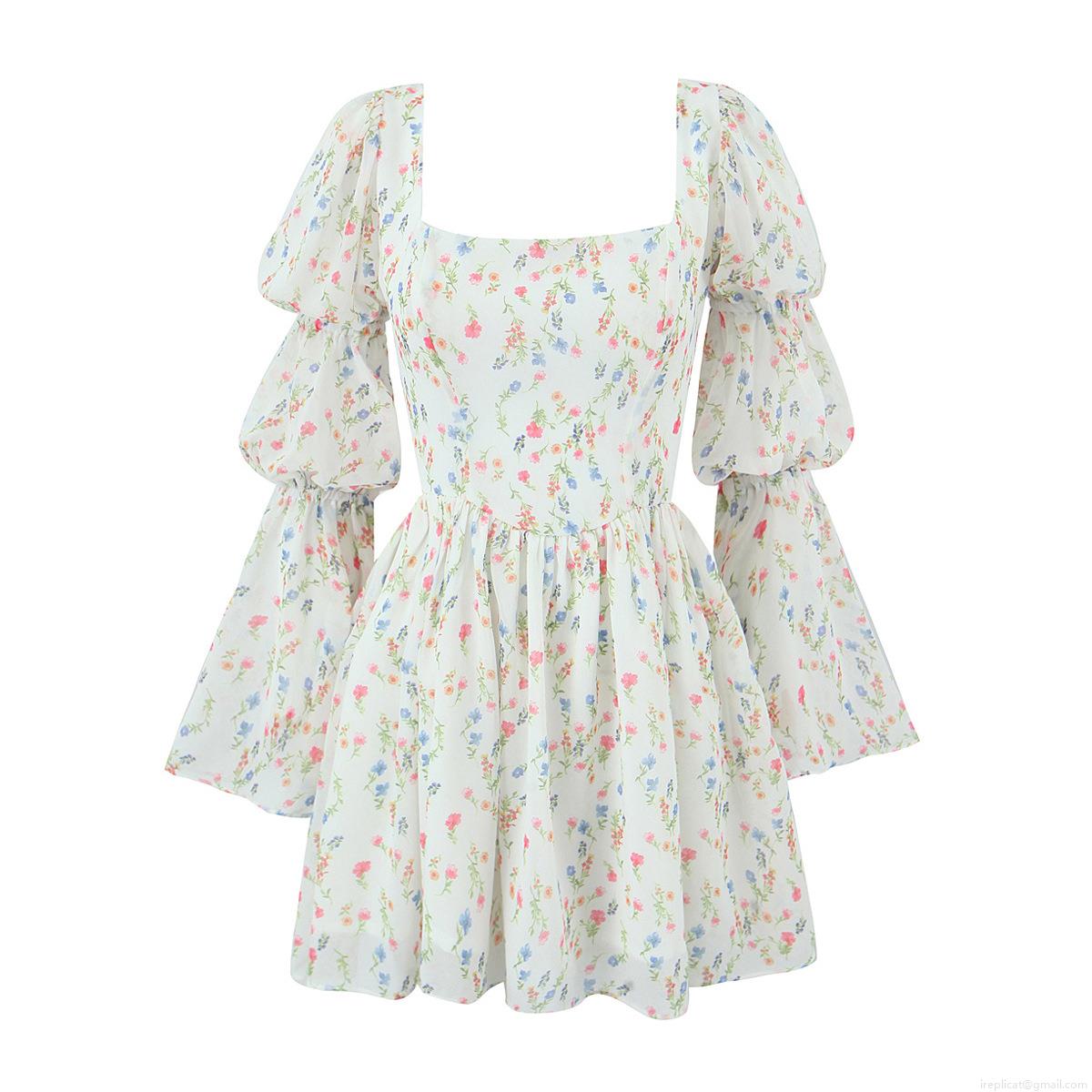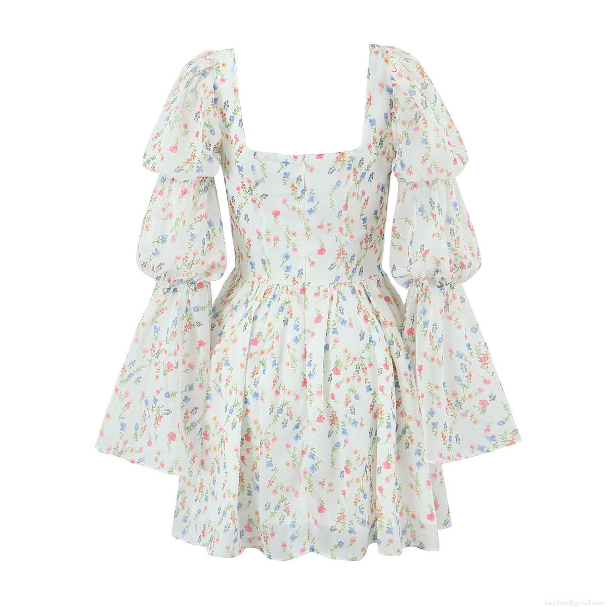 • Women's French Romantic Floral Mini Dress Square Neck Puff Bell Sleeve Long Sleeve Slim Fit A-Line Chiffon Summer Vacation Party Dress