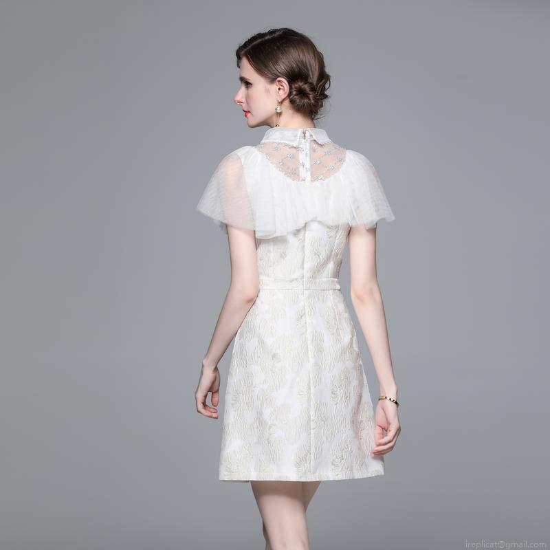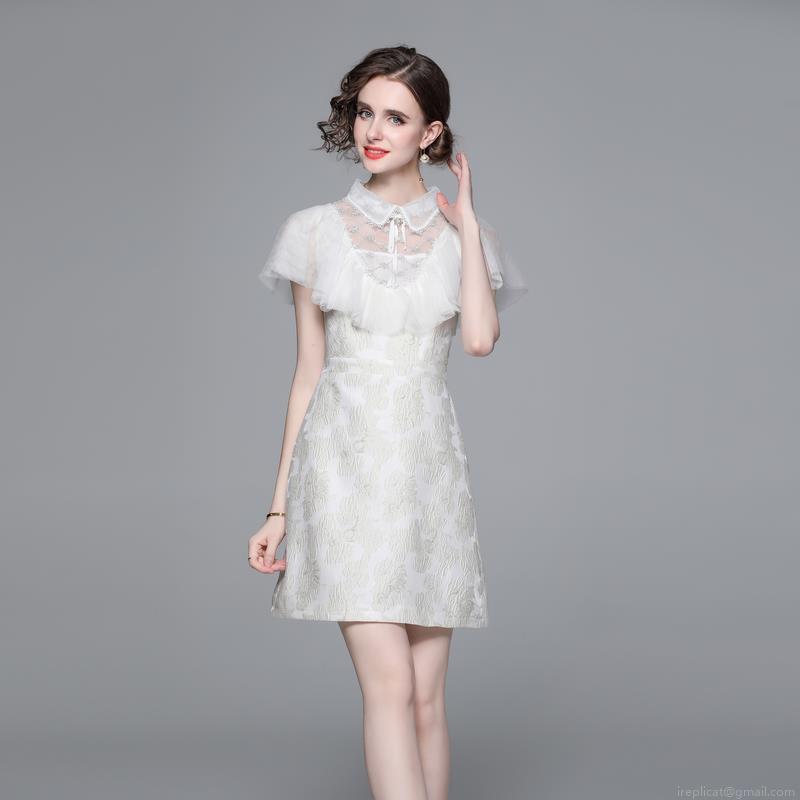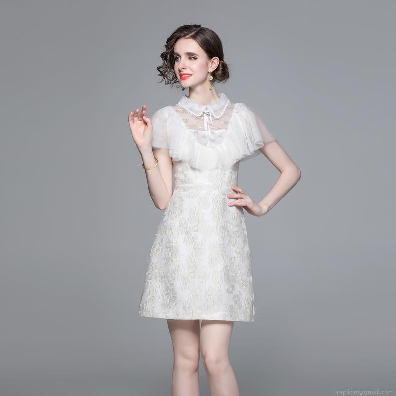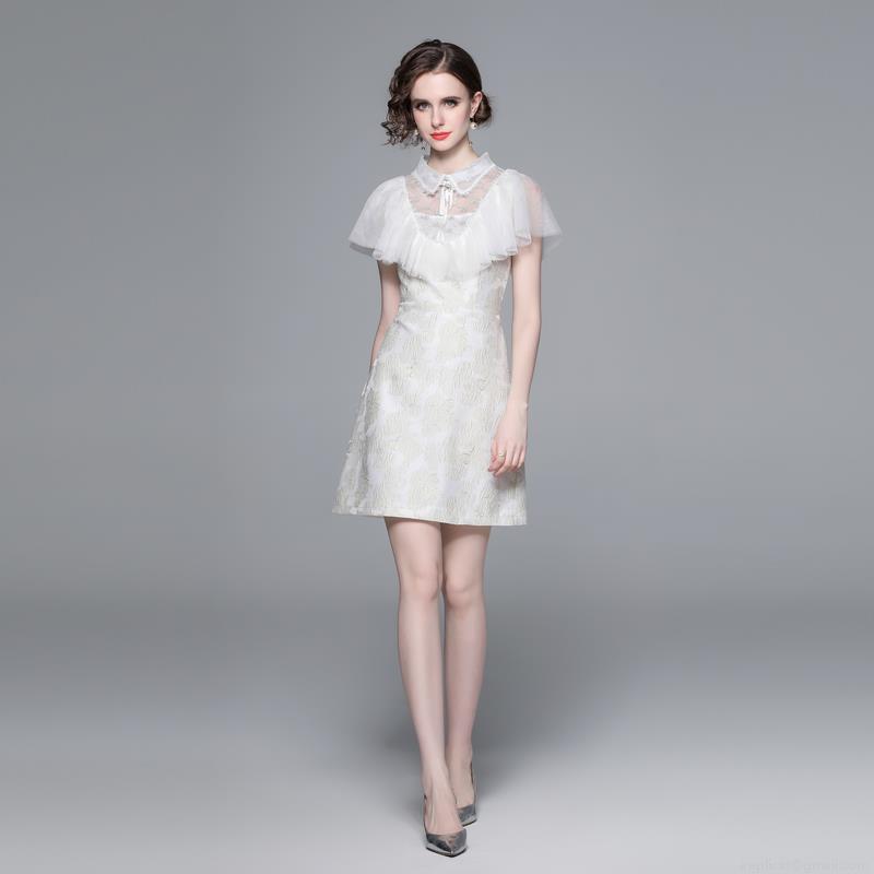 • Women's French Style Jacquard Dress Elegant Lace Patchwork Sleeveless A-Line Mini Dress With Doll Collar Bow Decoration For Party Wedding Evening Cocktail Ivory White