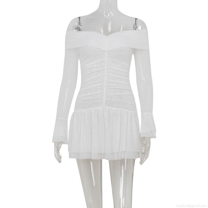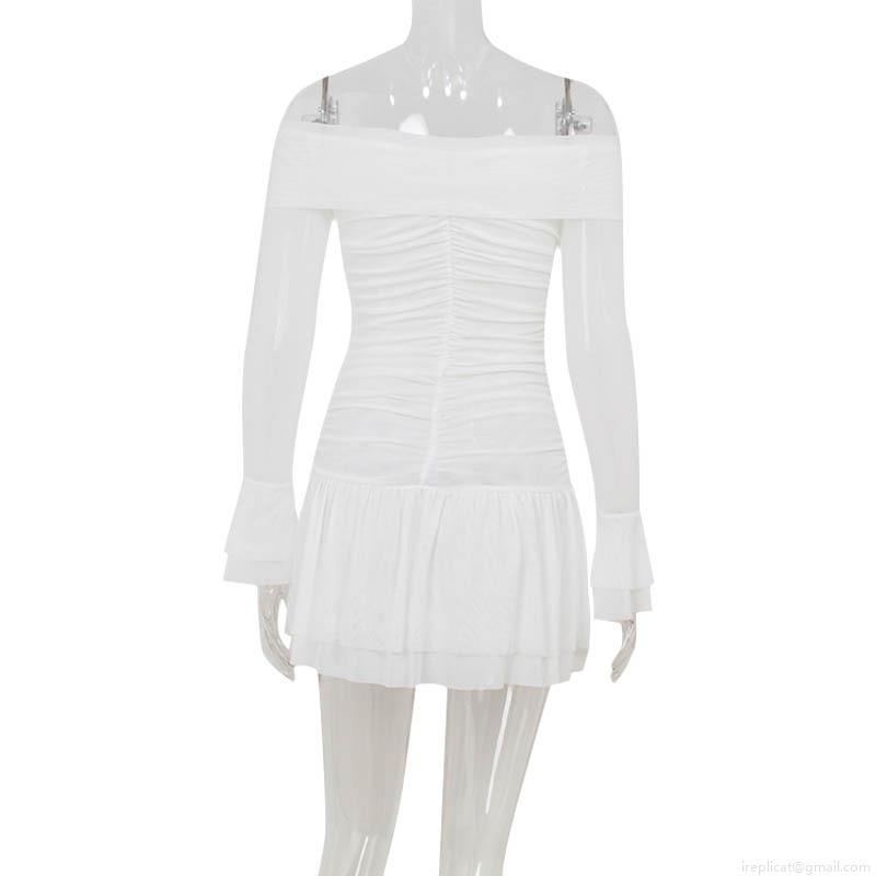 • Women's French Style Off-the-Shoulder Ruched Mini Dress Elegant Long Sleeve Ruffle Hem Sexy Bodycon Party Dress for Women White