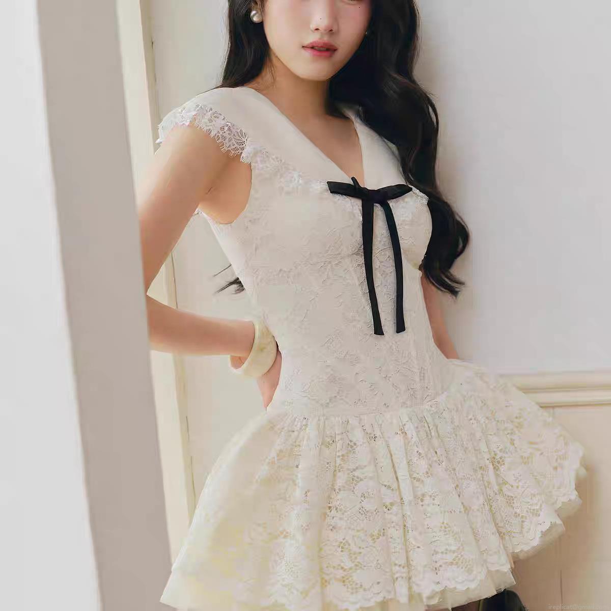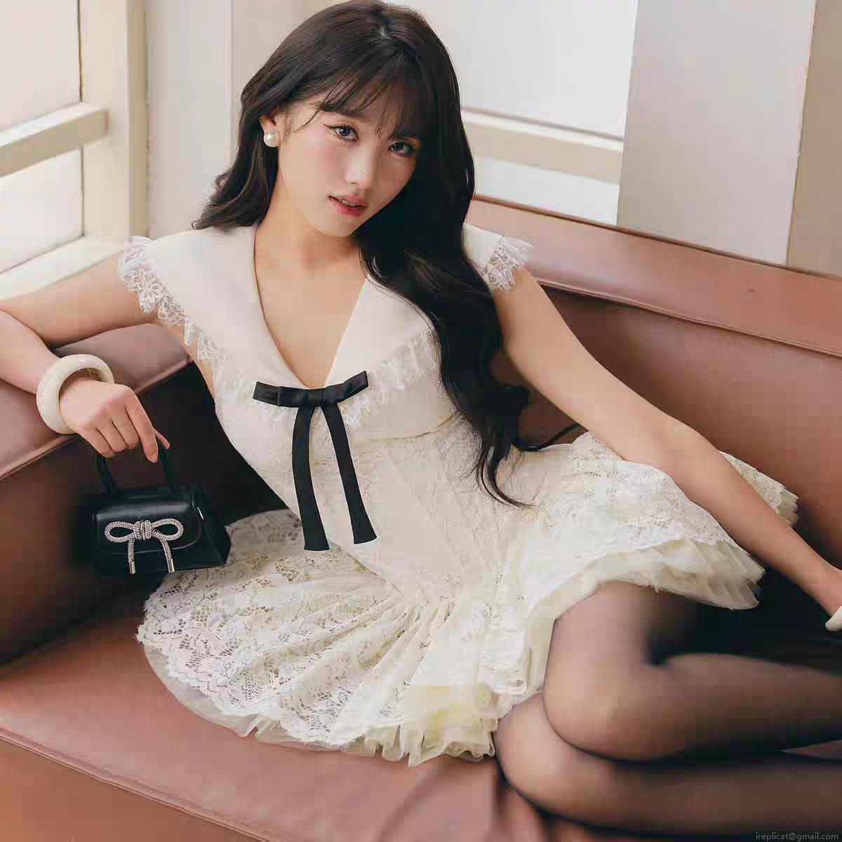 • Women's French Sweet Lace Mesh Mini Dress V-Neck Black Bow Short Sleeve Elegant Slim Fit Short Dress For Summer Party Dating Sexy Hot Girl Style