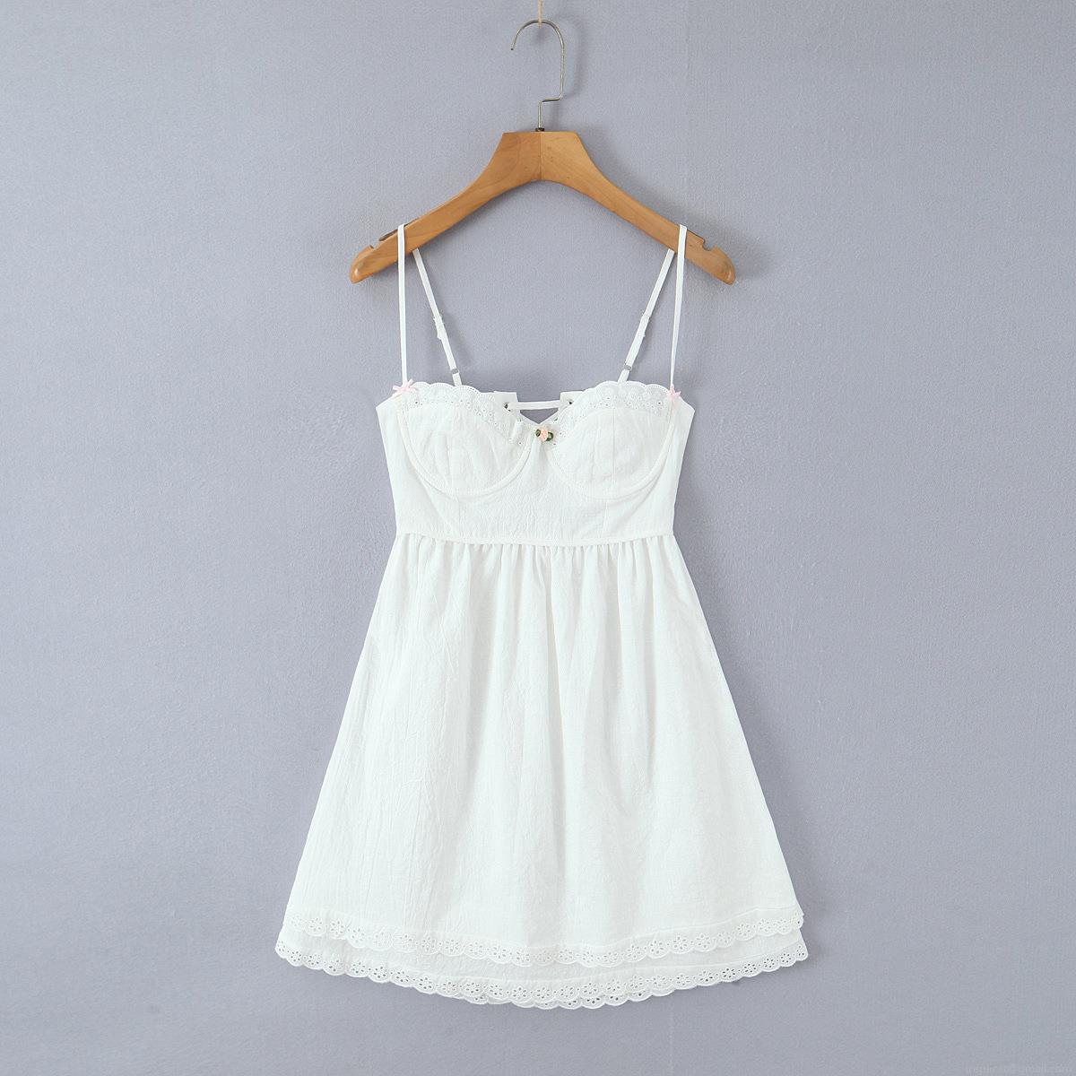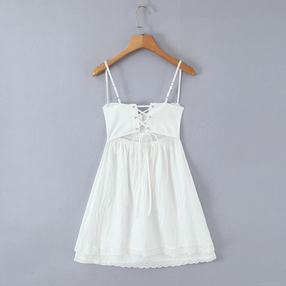 • Women's French Sweet White Cotton Mini Dress With Lace Eyelet Trim Sexy Backless Crisscross Lace-up Bow Cami Sundress For Summer Party