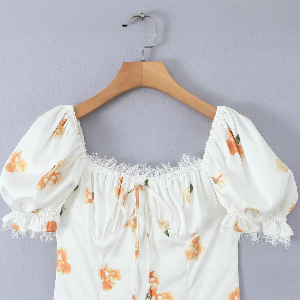 • Women's French Vintage Floral Print Mini Dress Square Neck Lace Trim Bubble Short Sleeve Cotton Blend Slim Fit A-Line Summer Sundress With Back Zipper