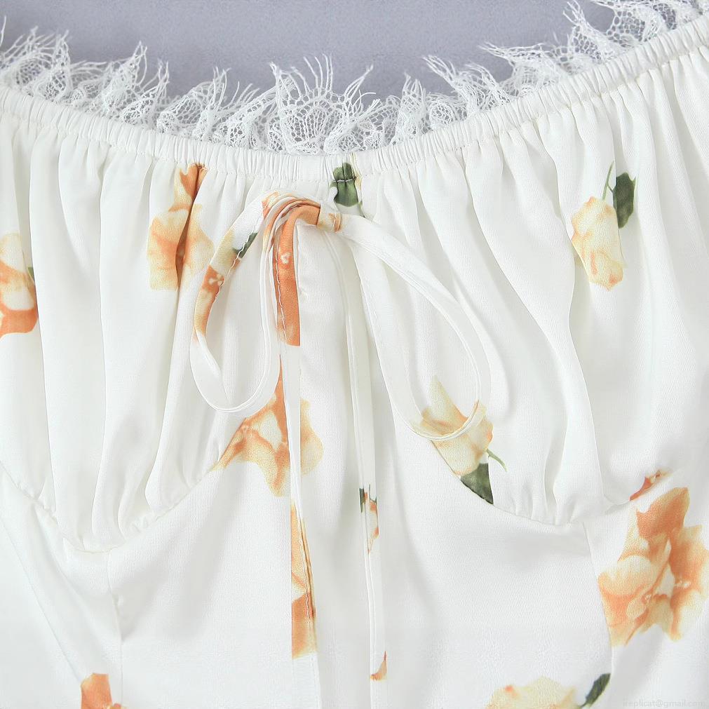 Bow, Floral Pattern, Rose, Lace Trim, Puff Sleeves, Drawstring, Patchwork Print, Square Collar