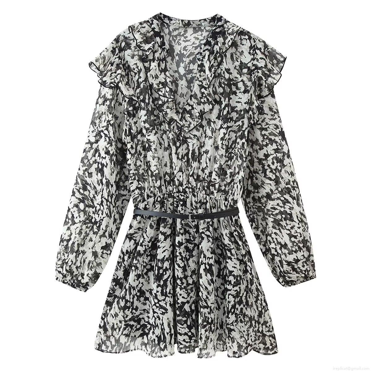 • Women's French Vintage V Neck Ruffle Long Sleeve Dress With Belt Black White Abstract Floral Print High Waist Chiffon Feel Flowy Mini A-Line Dress For Party Daily Wear