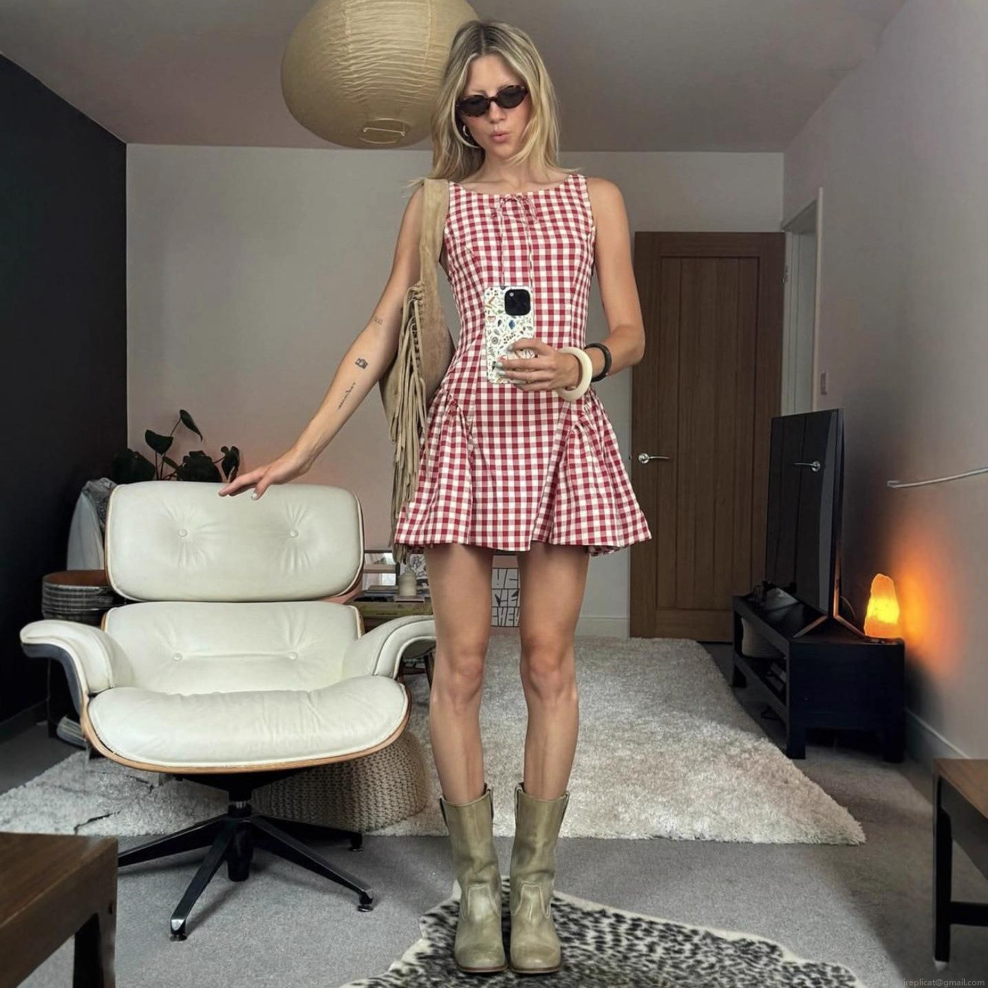 • Women's Gingham Mini Dress Cotton Blend Sleeveless Square Neck Bow Tie Waist A-Line Pastoral Style Dress for Summer Vacation Daily Wear