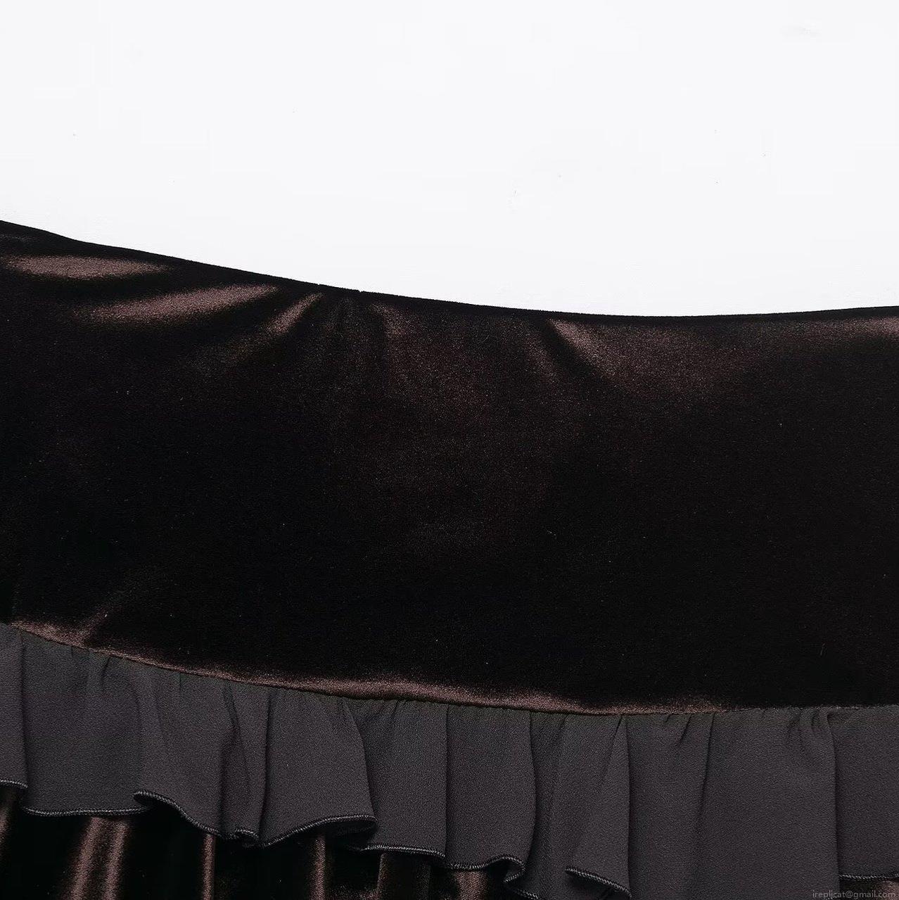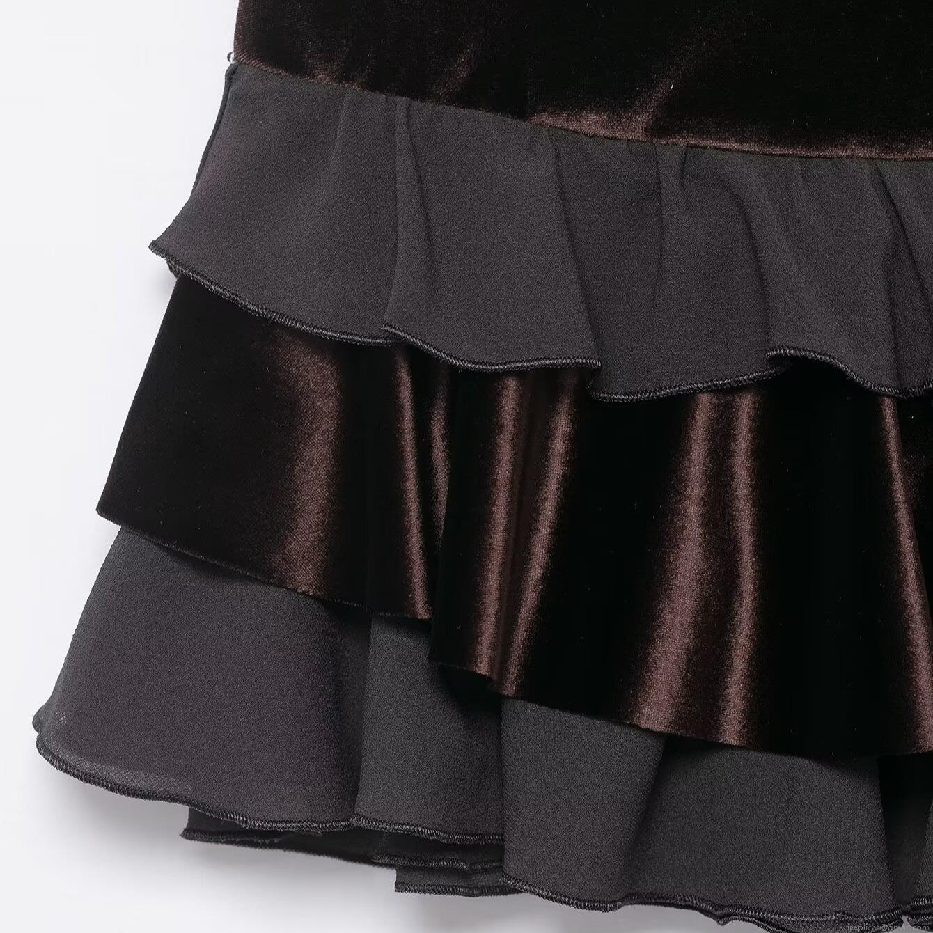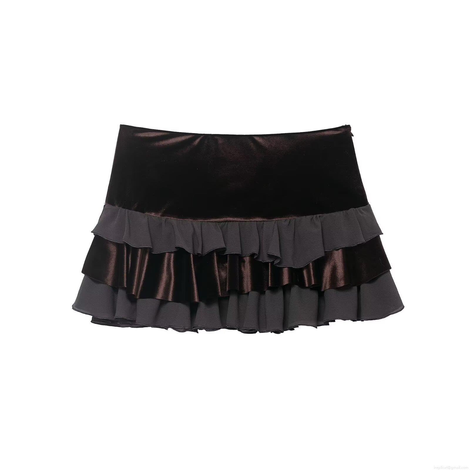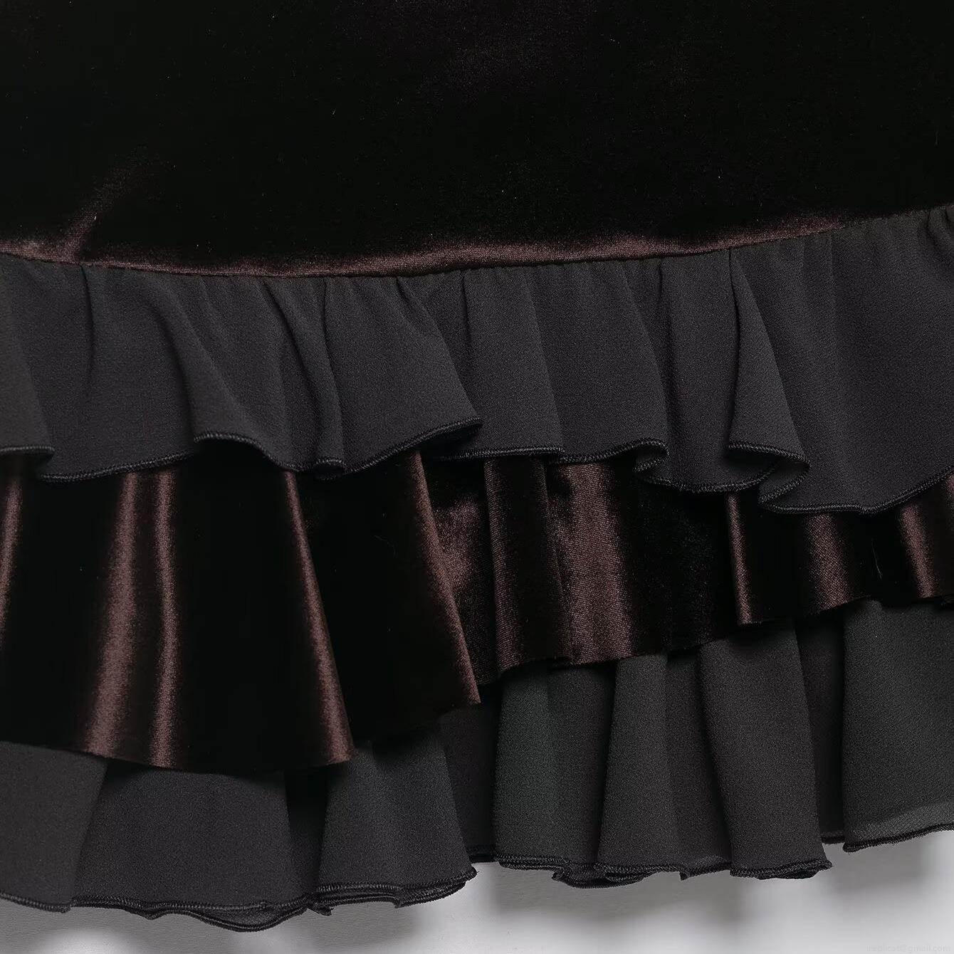 • Women's Gothic Sexy Velvet Patchwork Layered Ruffle Mini Skirt High Waist Dark Brown Black Cake Skirt Clubwear Party Bottoms