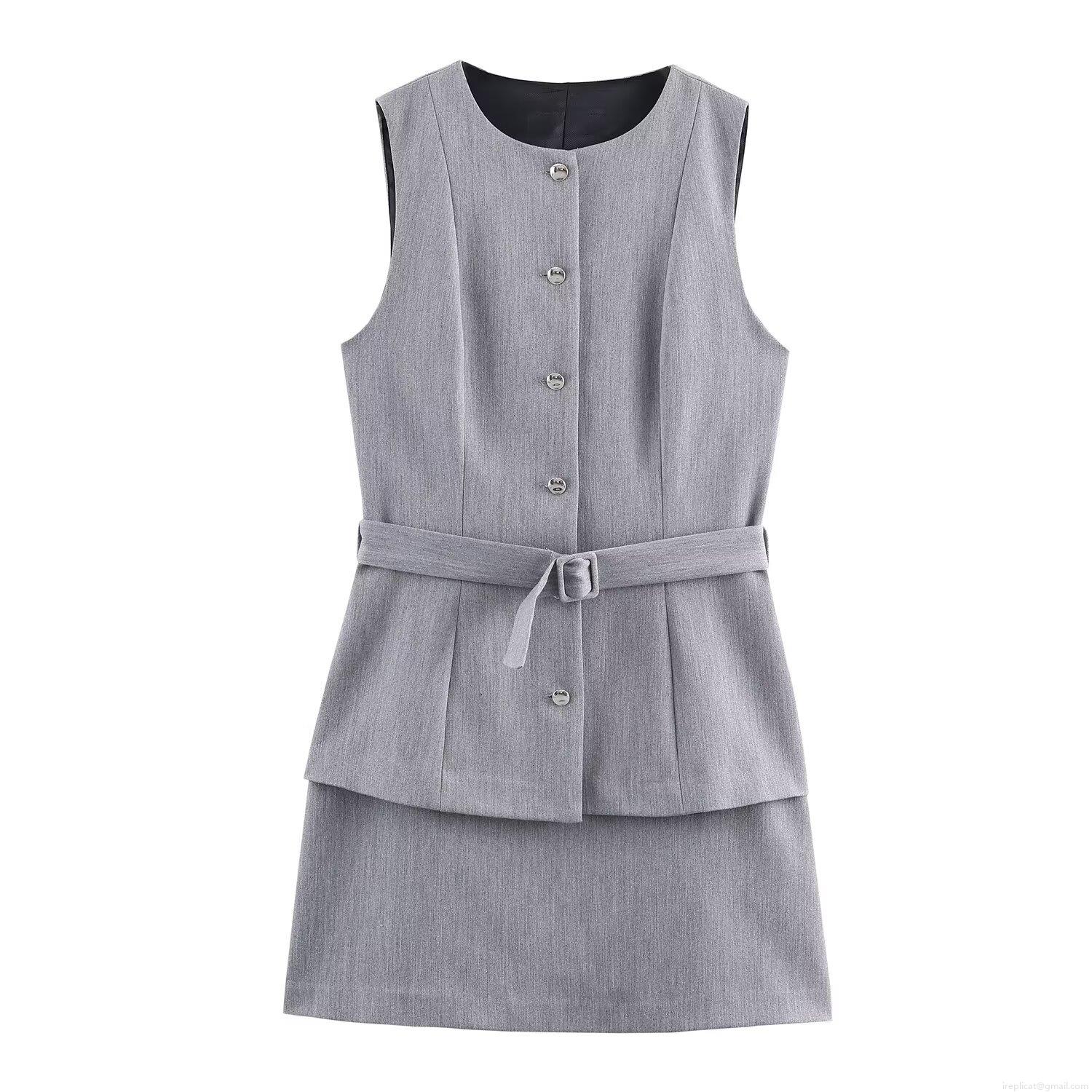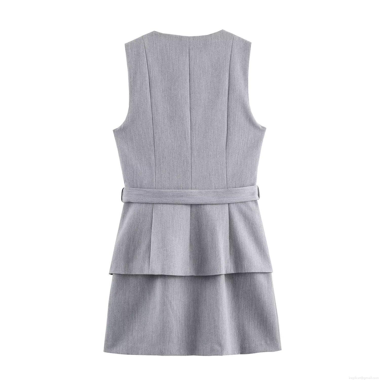 Women's Grey Sleeveless Two-Piece Effect Mini Dress Office Style Woven Polyester Vest Dress With Belt And Metal Buttons Elegant Lady Outfit