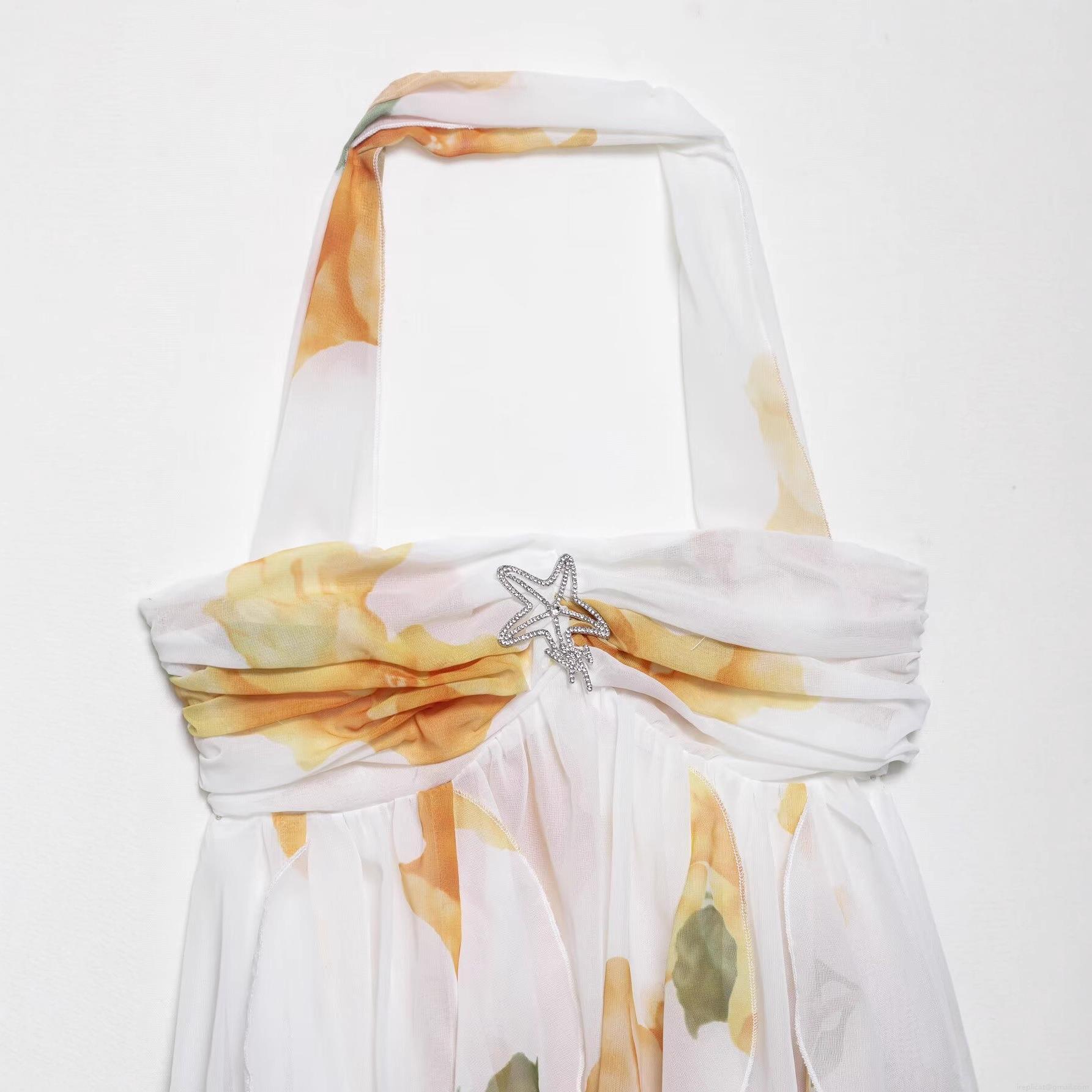 Women's Halter Neck Floral Print Chiffon Mini Dress With Layered Ruffles And Starfish Rhinestone Brooch Elegant Backless Party Summer Dress