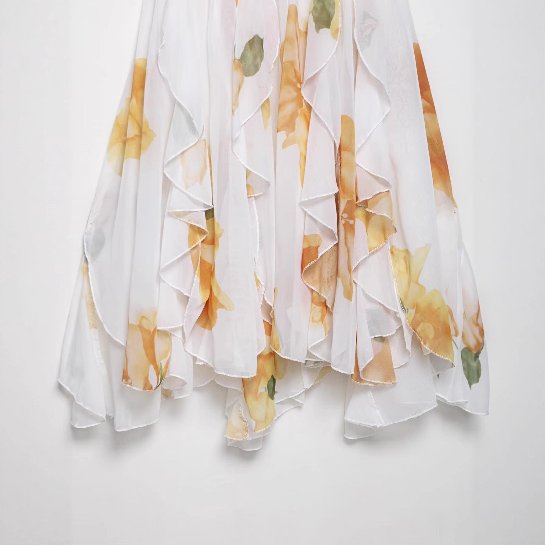 Floral Pattern, Ruffles, Neckband, Backless, Irregular Hem, Rhinestone Decoration, Abstract Flowers