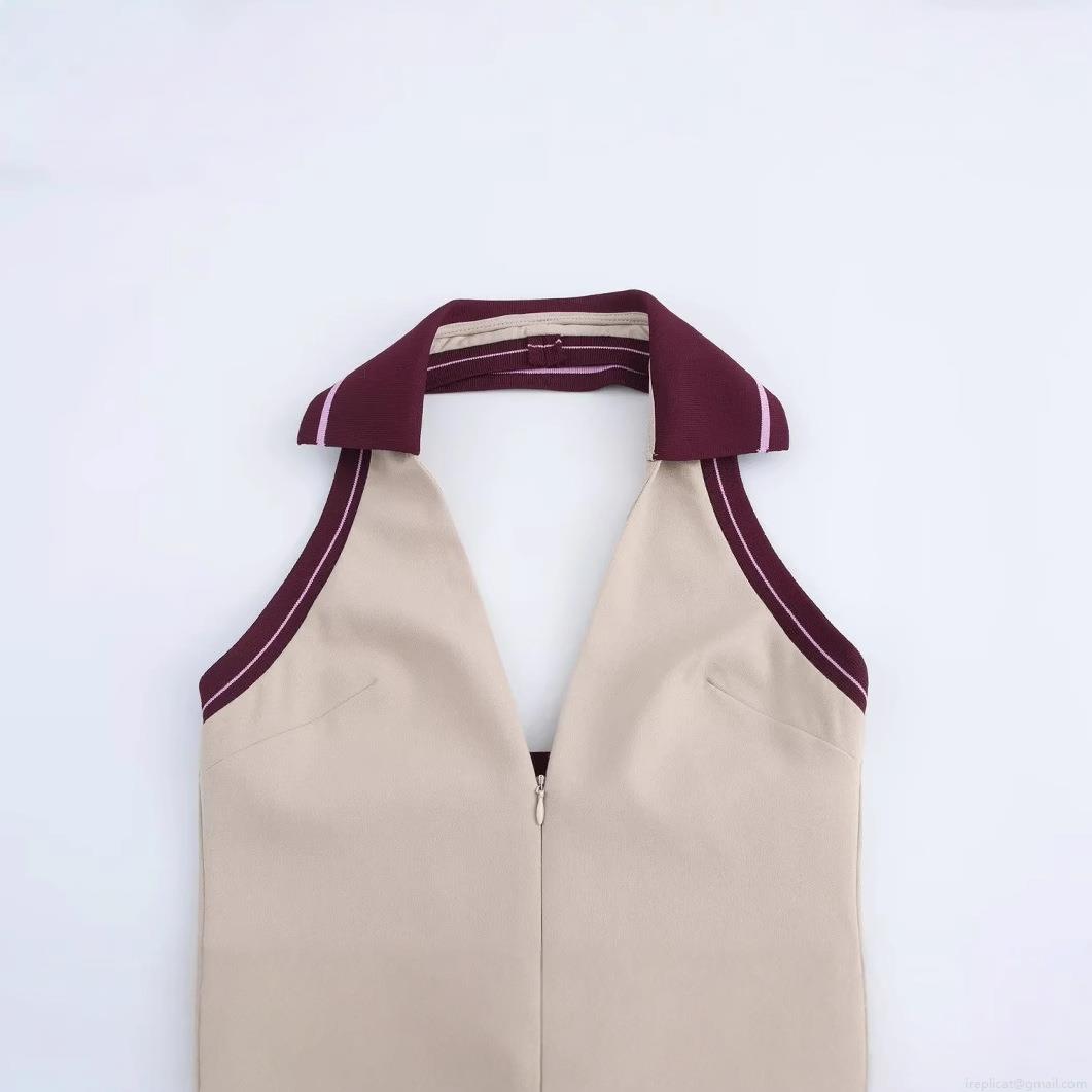 • Women's Halter Neck Mini Dress Sexy V-Neck Sleeveless Contrast Color Patchwork Dress With Zipper Front And Drawstring Waist Elegant Slim Fit Short Dress For Summer Party
