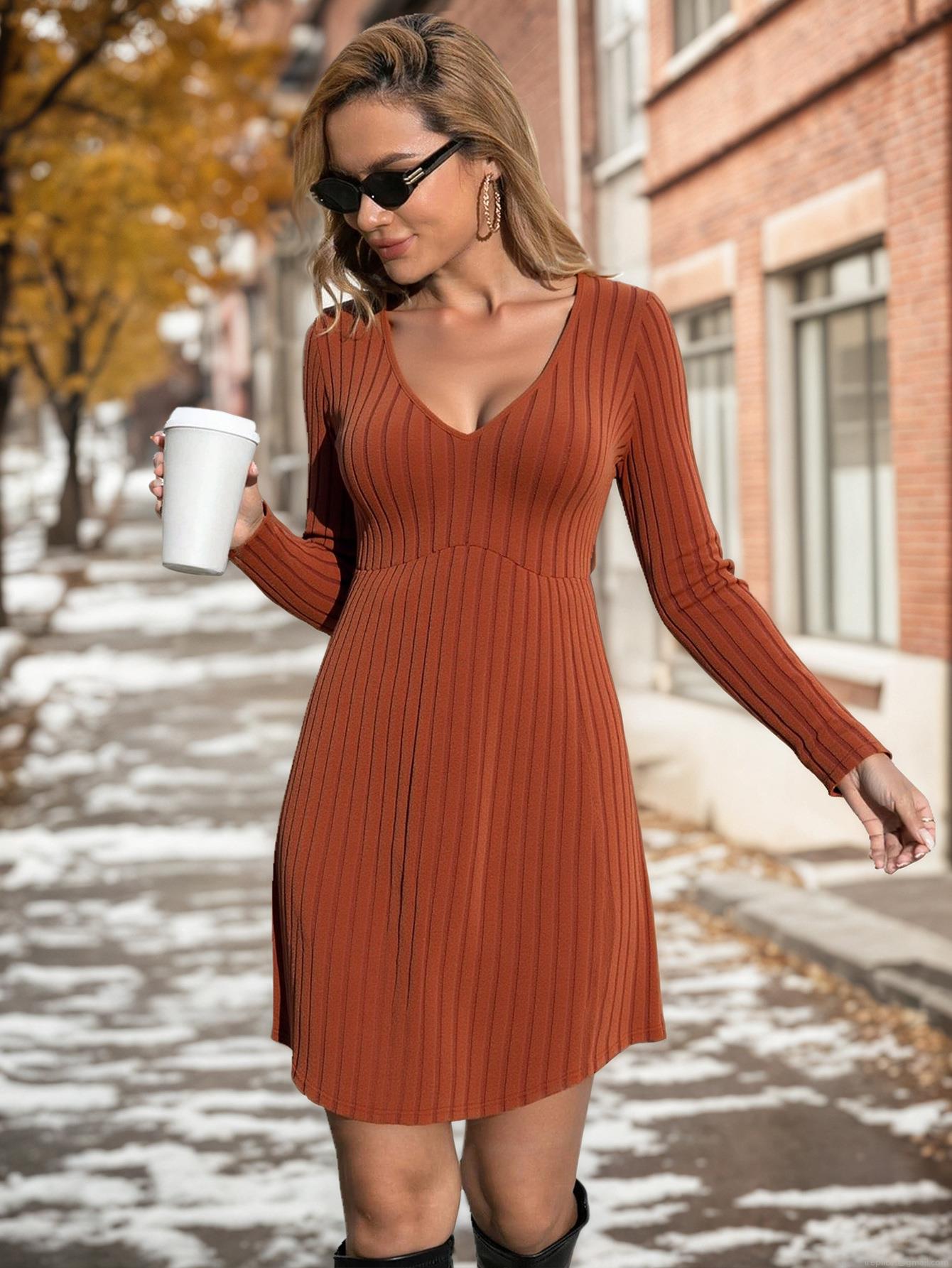 • Women's Knit V-Neck Mini Dress Long Sleeve Ribbed Striped Slim Fit Bodycon Sweater Dress For Autumn Winter Casual Streetwear