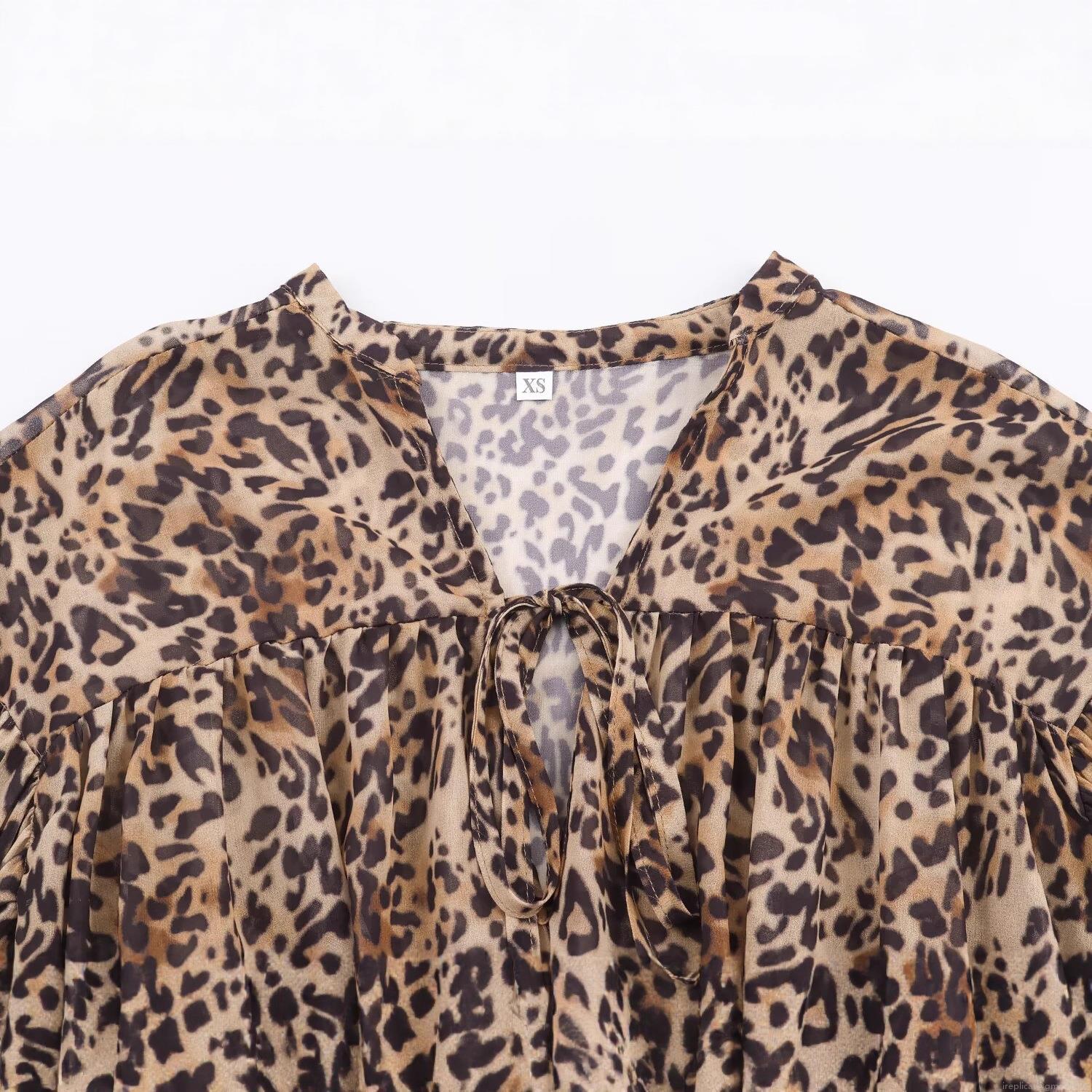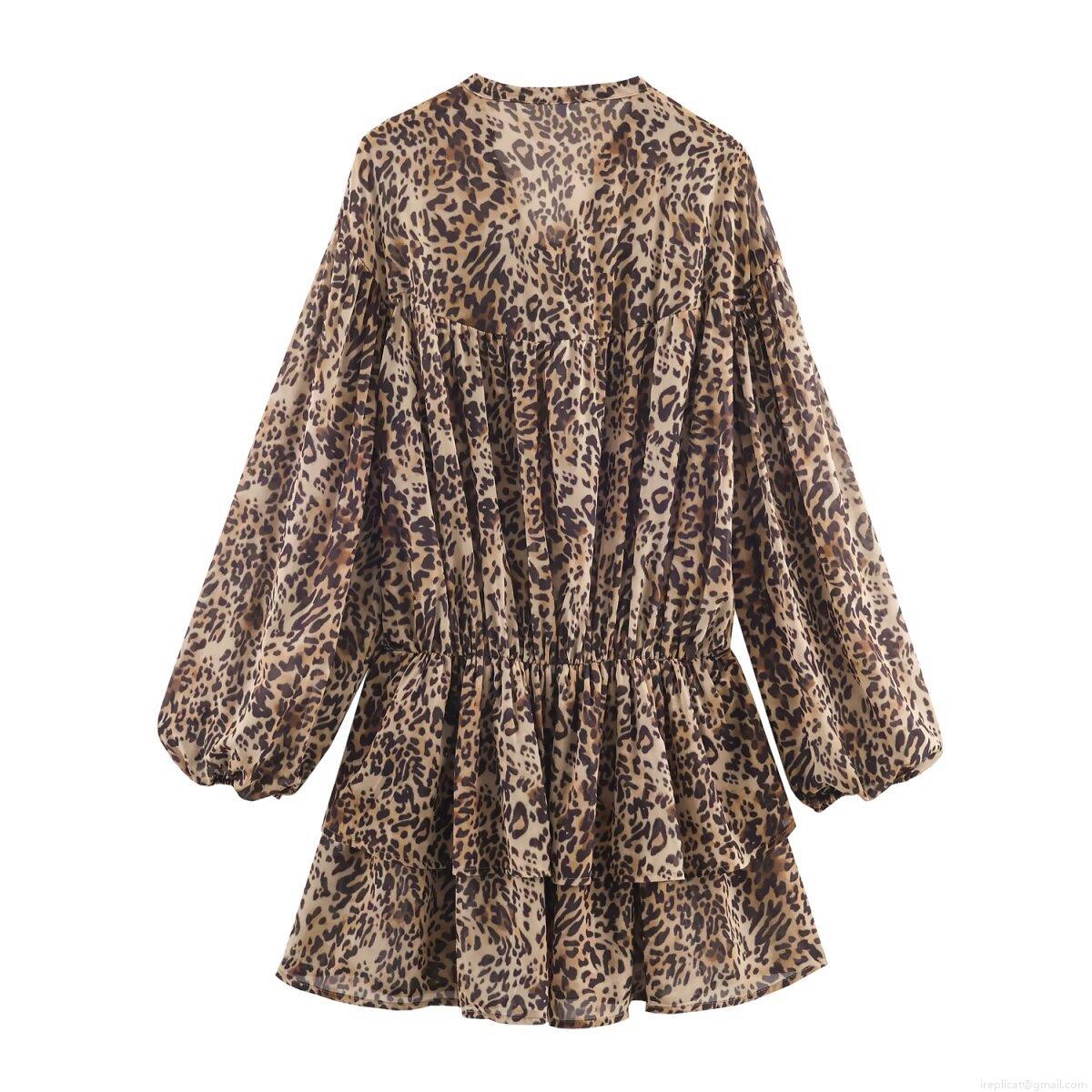 • Women's Leopard Print Long Sleeve V-Neck Mini Dress Tiered Ruffle Layered Chiffon Feel Streetwear Casual Party Fashion Dress
