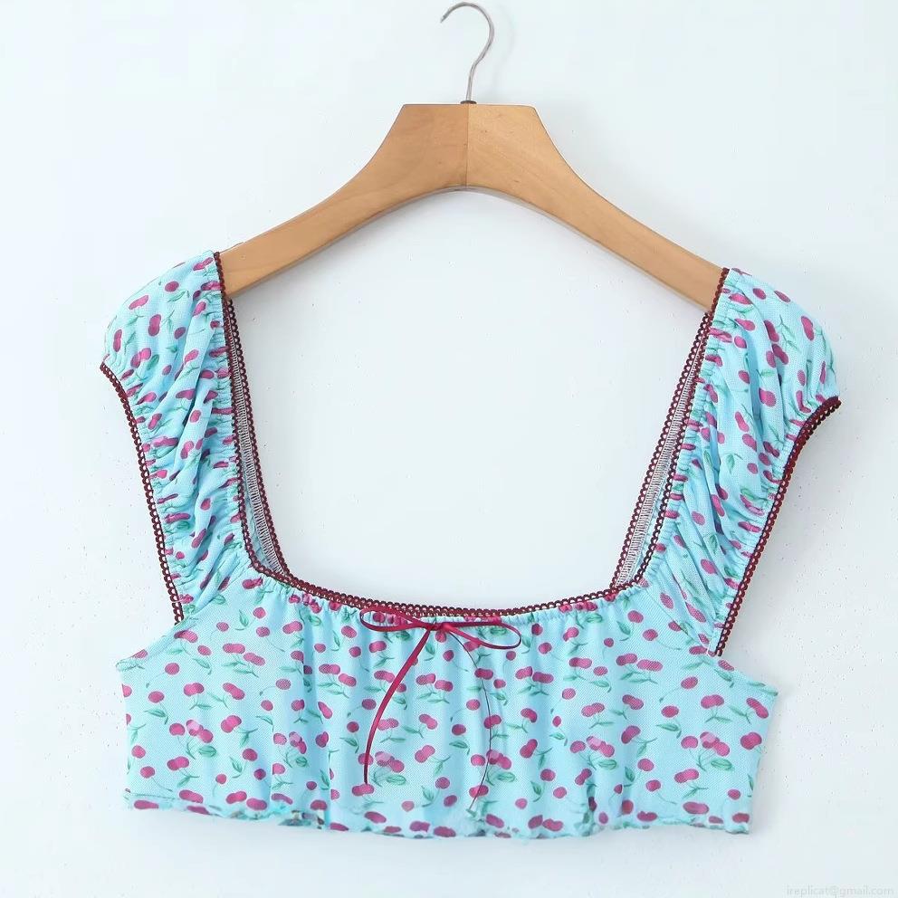 • Women's Light Blue Cherry Print Mesh Mini Dress Square Neck Bow Sleeveless Cami Bodycon Dress Summer Sweet Pastoral Style Sundress Streetwear