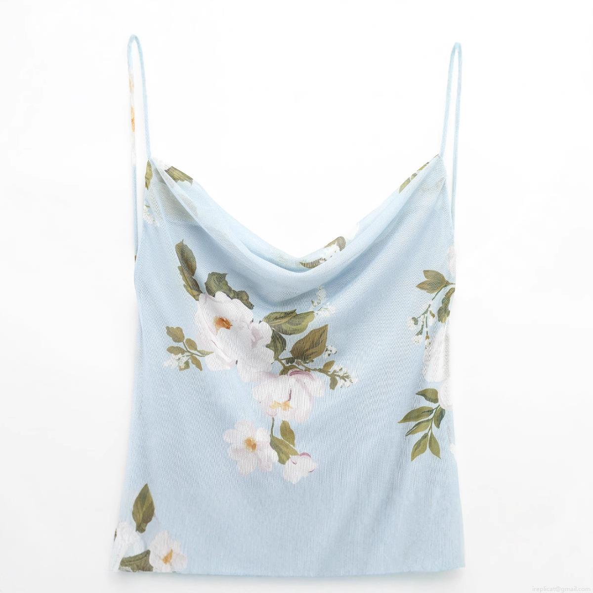 Women's Light Blue Floral Print Cowl Neck Mesh Mini Dress Sexy Spaghetti Strap Asymmetrical Ruffle Hem Summer Vacation Beach Party Sleeveless Short Dress