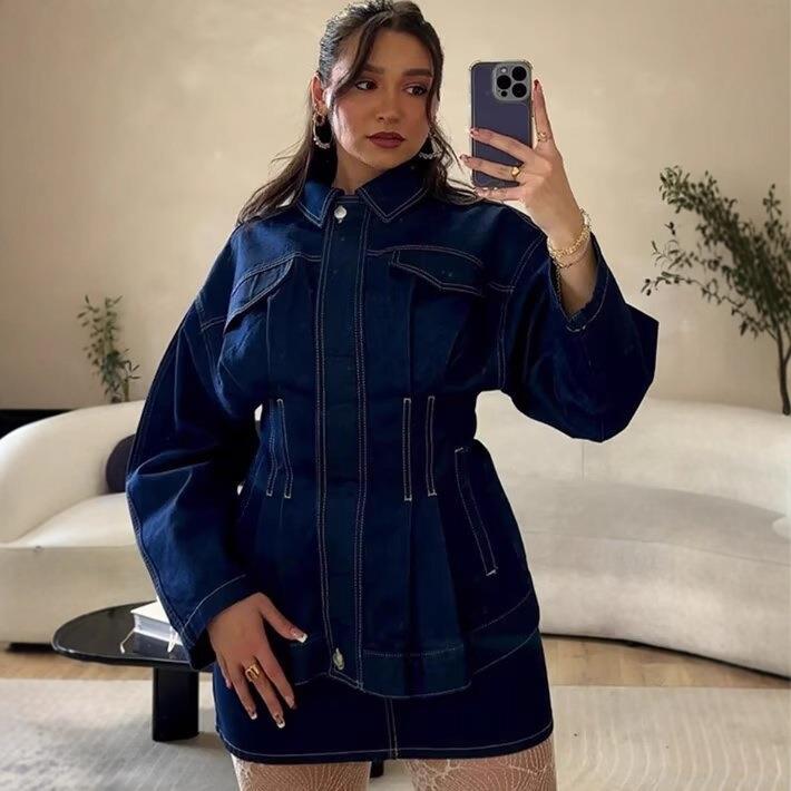 Women's Long Sleeve Denim Mini Dress Contrast Stitching Slim Fit Lapel Button Down Street Style Dark Blue Retro Jean Dress For Daily Streetwear