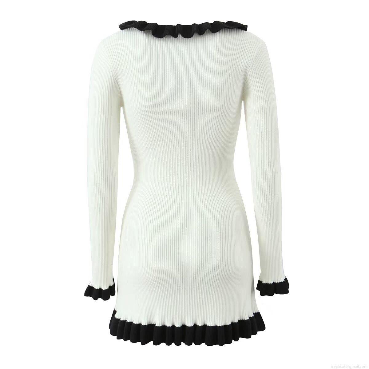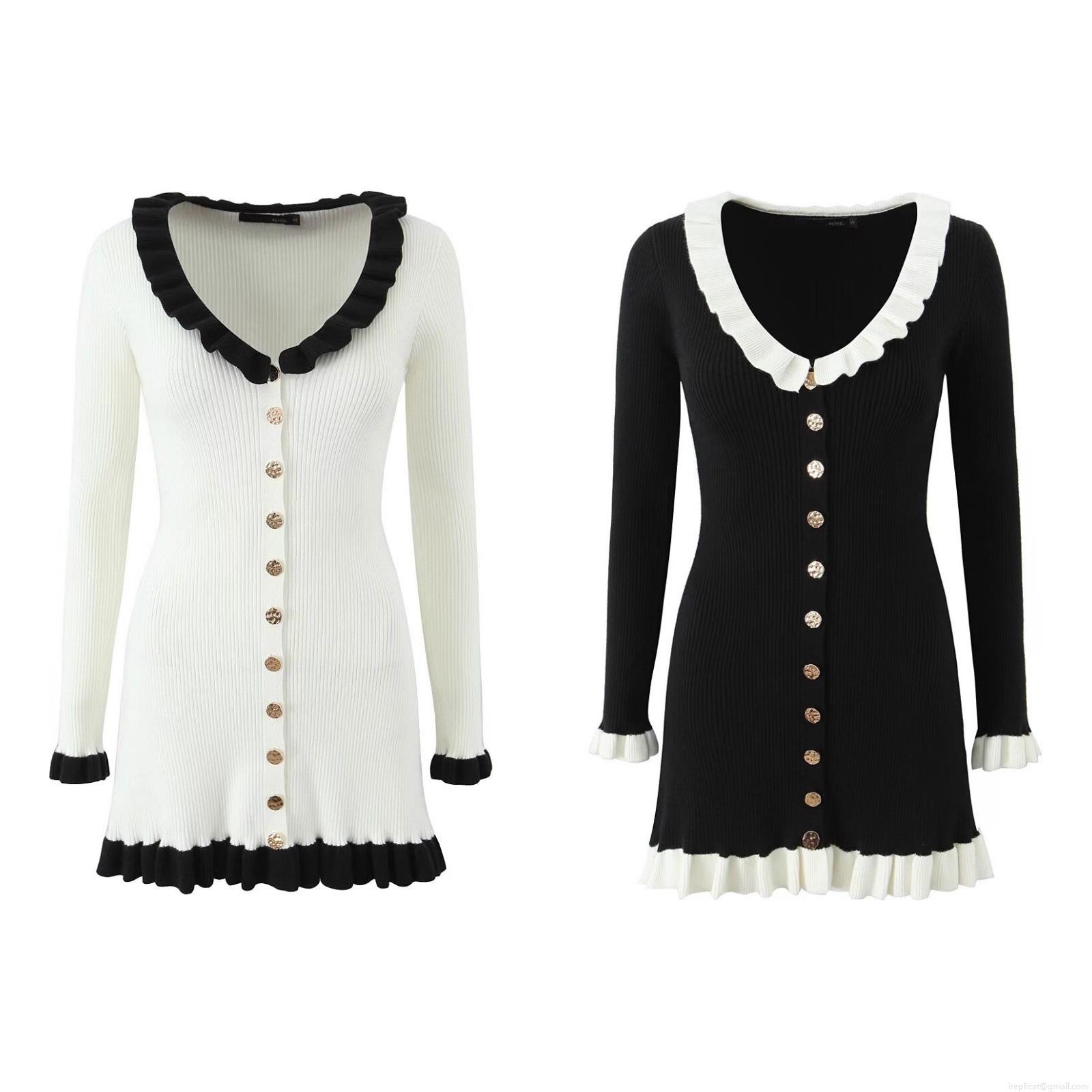 Women's Long Sleeve Knit Dress Contrast Color Ruffle V-Neck Mini Dress With Gold Buttons Elegant Slim Fit Streetwear Party Dress