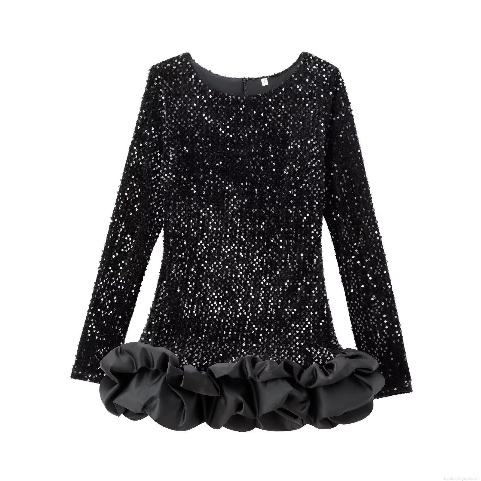 • Women's Long Sleeve Sequin Mini Dress Elegant Balletcore Style 3D Ruffle Hem Satin Patchwork Bodycon Party Evening Dress For Cocktail Prom Ladies