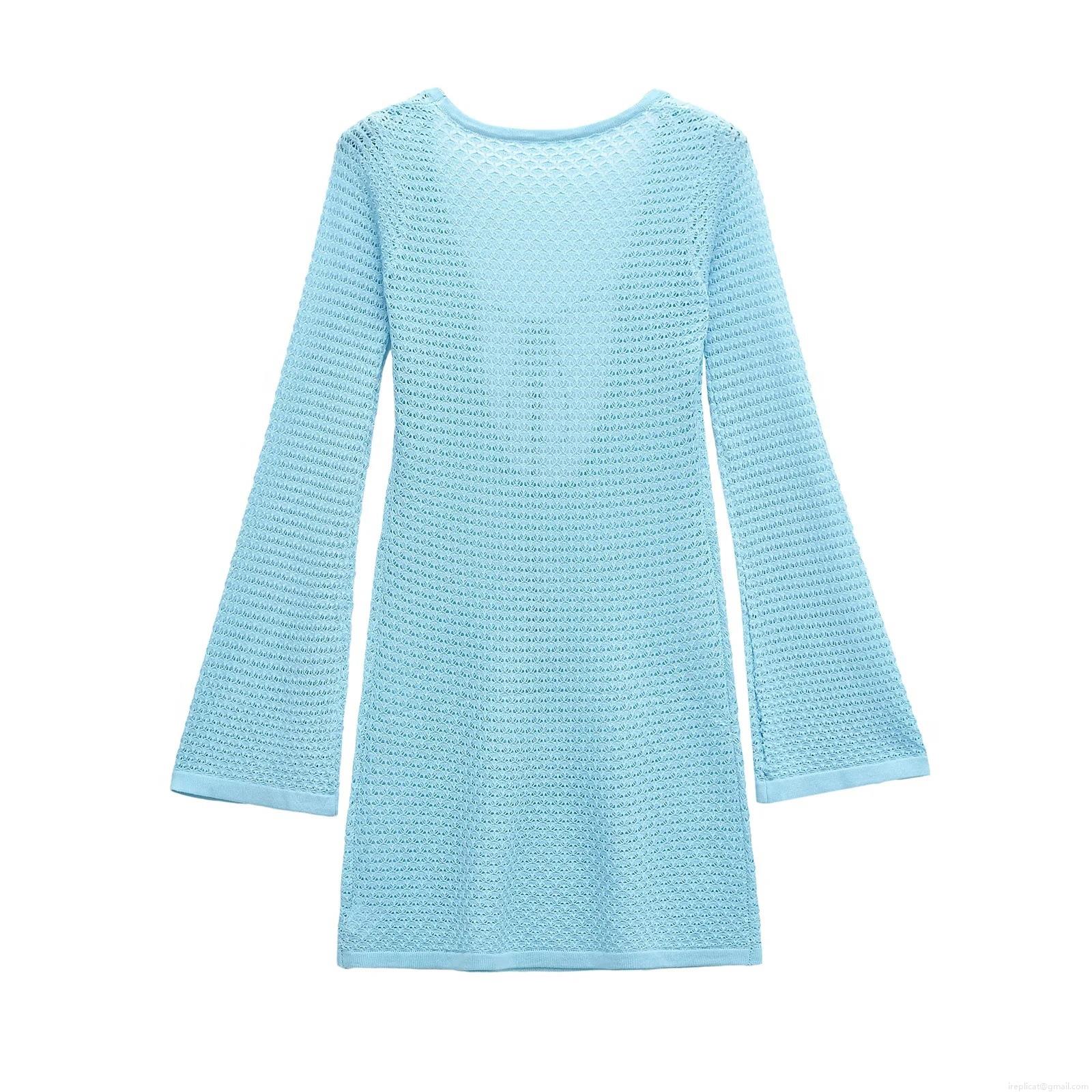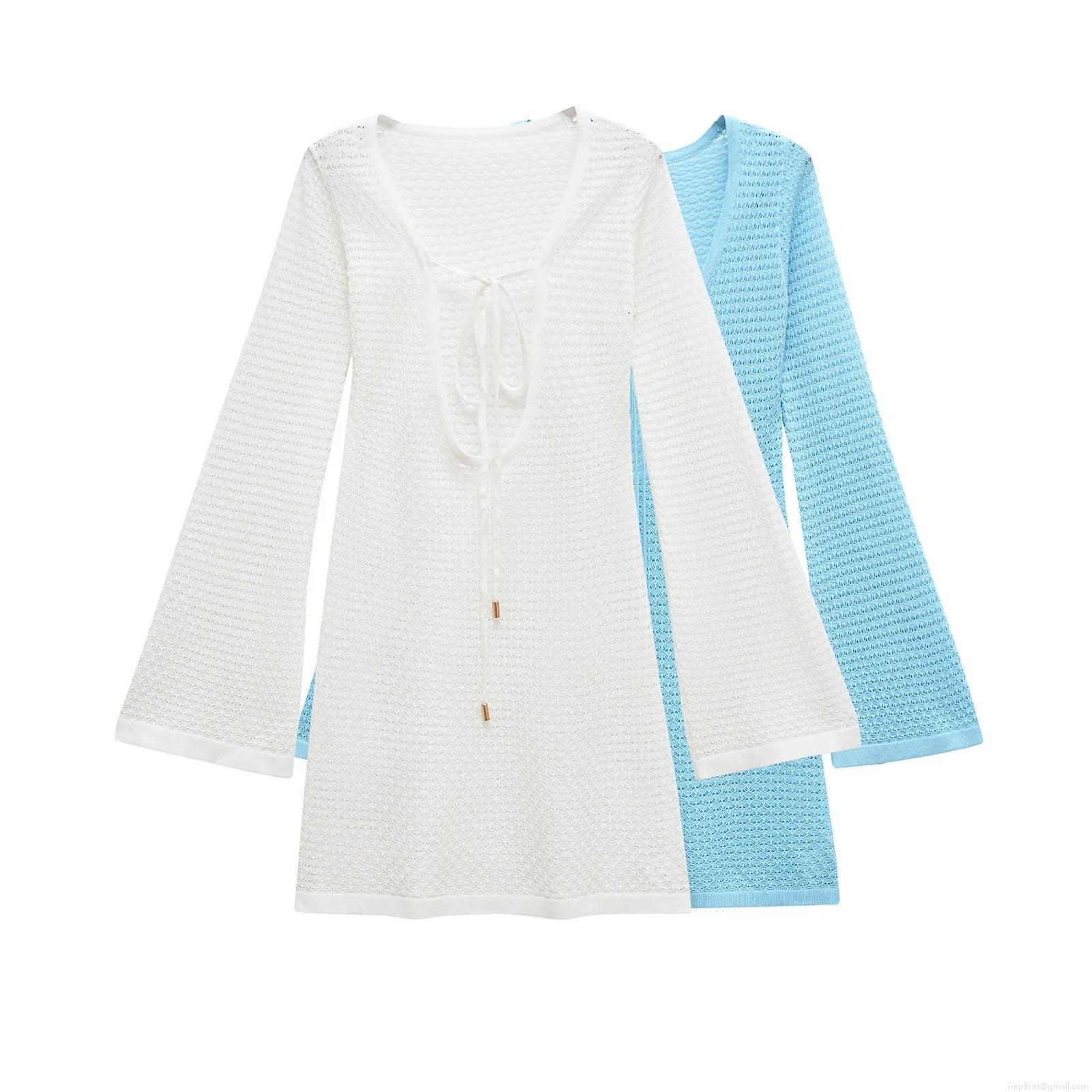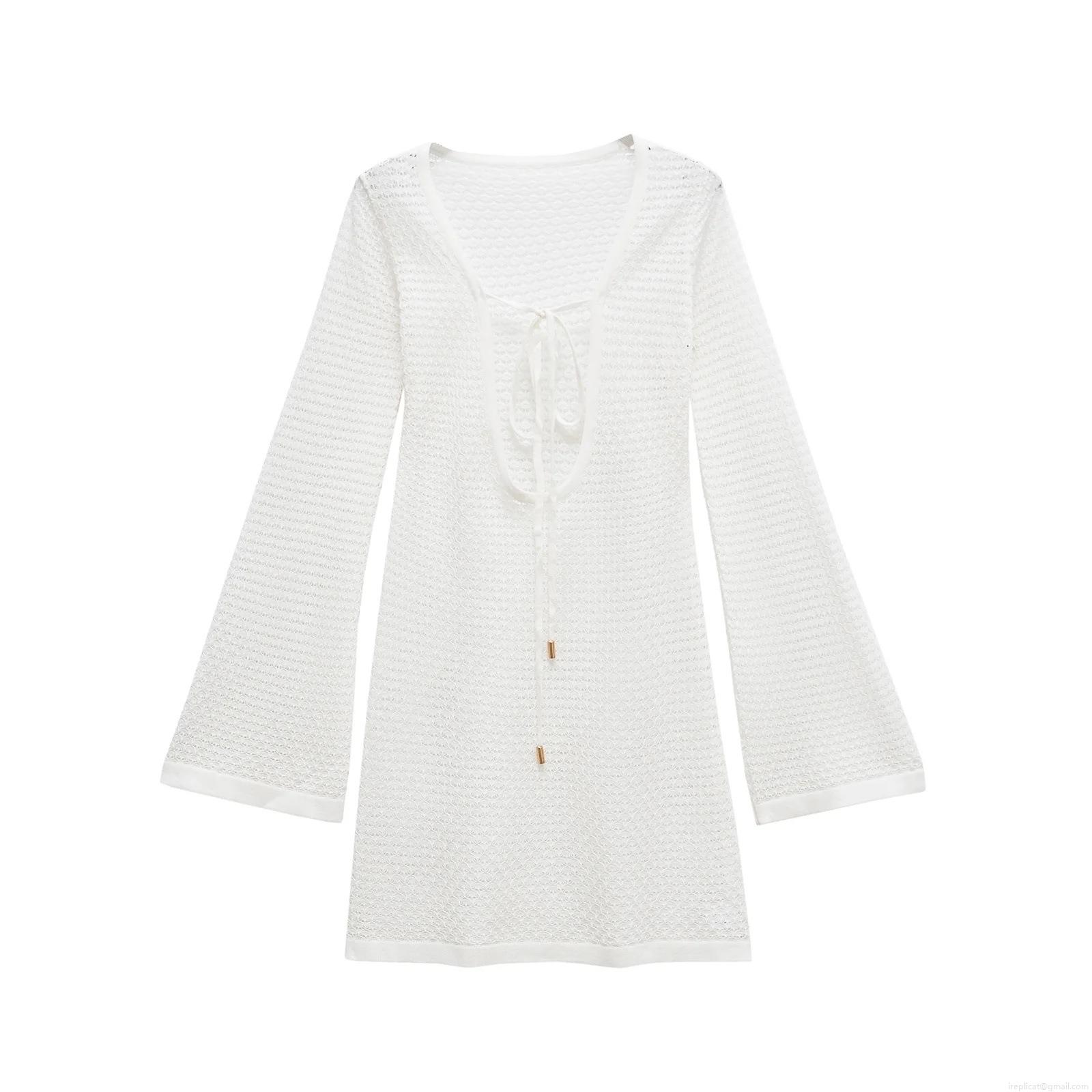 • Women's Mercerized Cotton Hollow Out Crochet Mini Dress Sexy V-Neck Tie Front Bell Sleeve Beach Bikini Cover-Up For Vacation