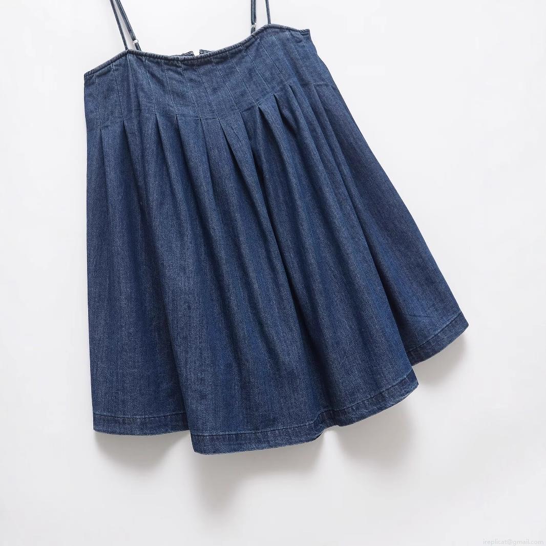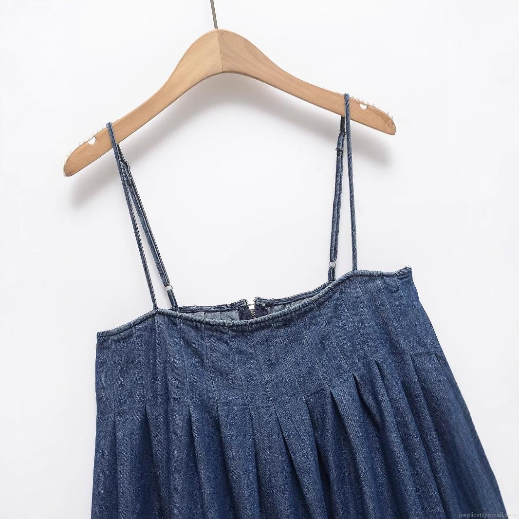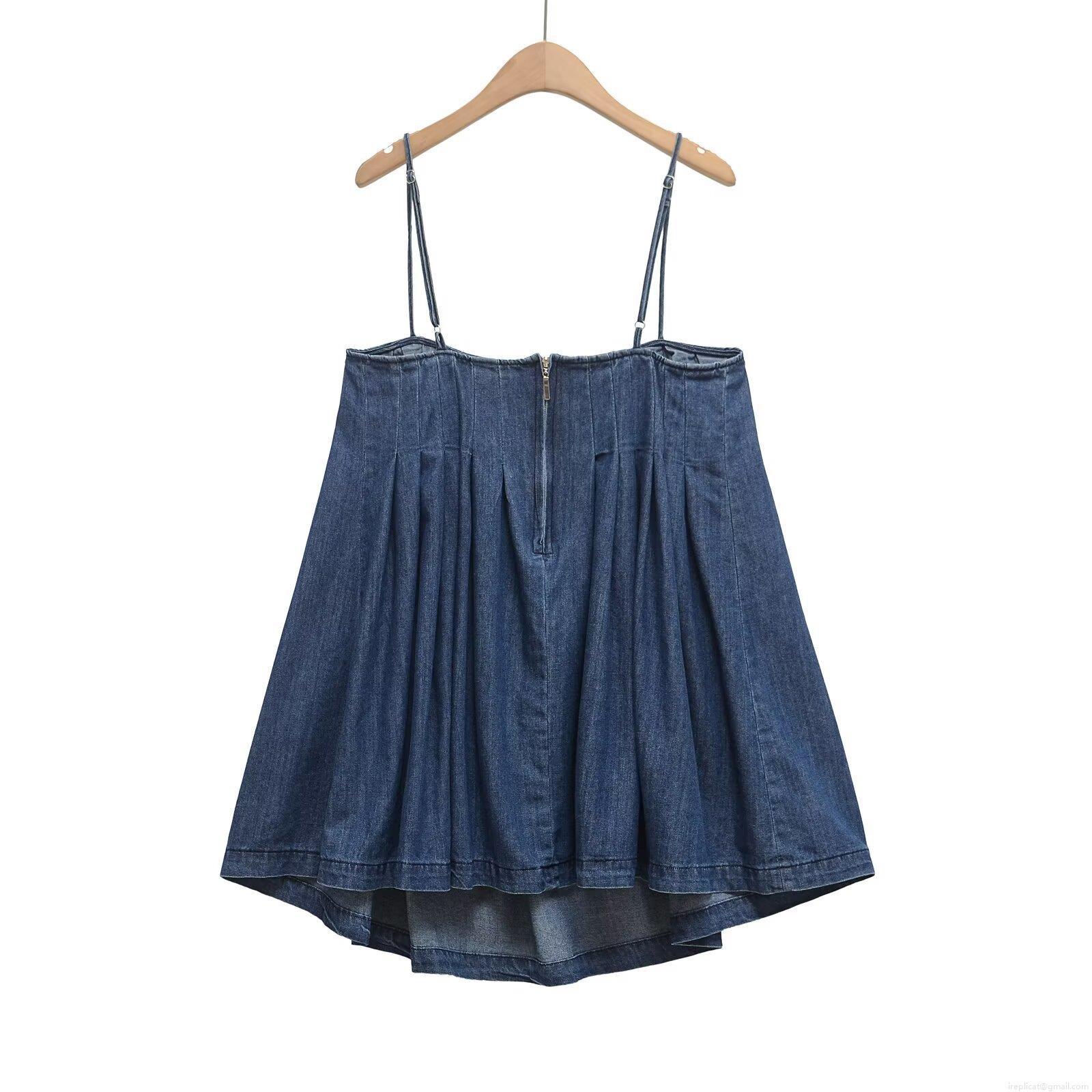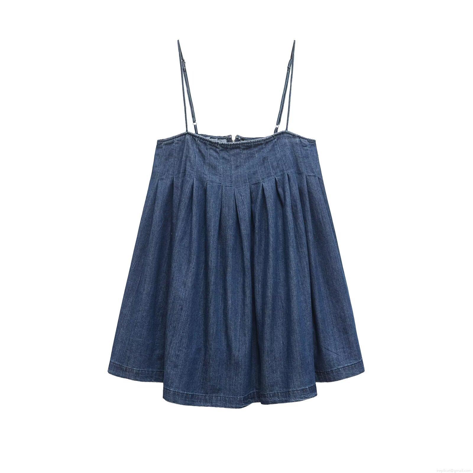 Women's Navy Blue Denim Look Camisole Dress Pleated Chest A-Line Mini Dress With Adjustable Straps Back Zipper Casual Summer Elegant Outfits