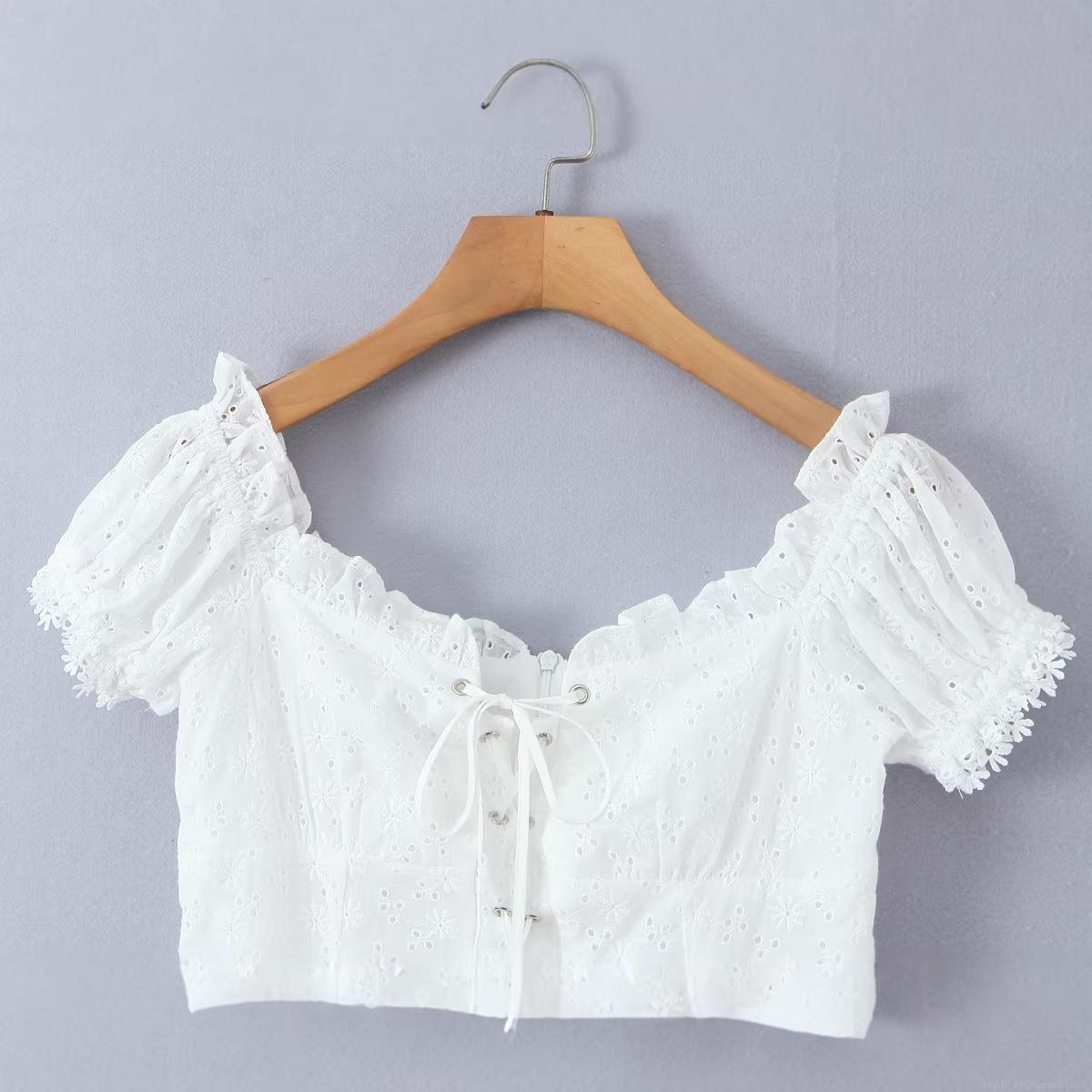 Solid Color, Embroidery, Hollow Out, Ruffles, Flowers, Lace, Puff Sleeves