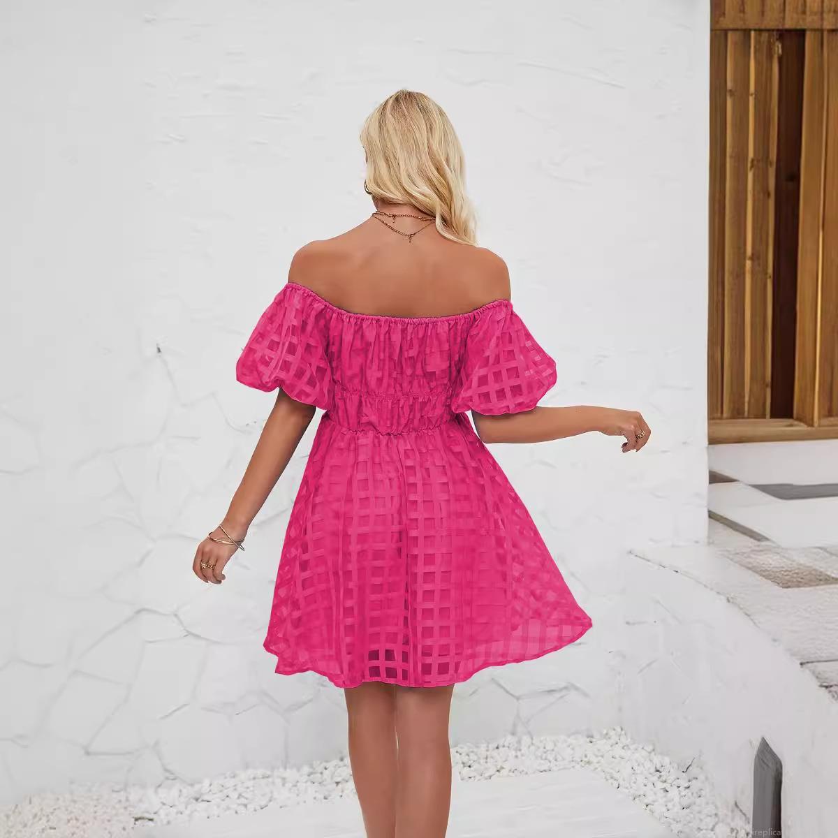 • Women's Off-Shoulder Puff Sleeve Mini Dress Solid Color Grid Mesh Ruffled High Waist A-Line Dress For Summer Vacation Party Sexy Beach Short Dress