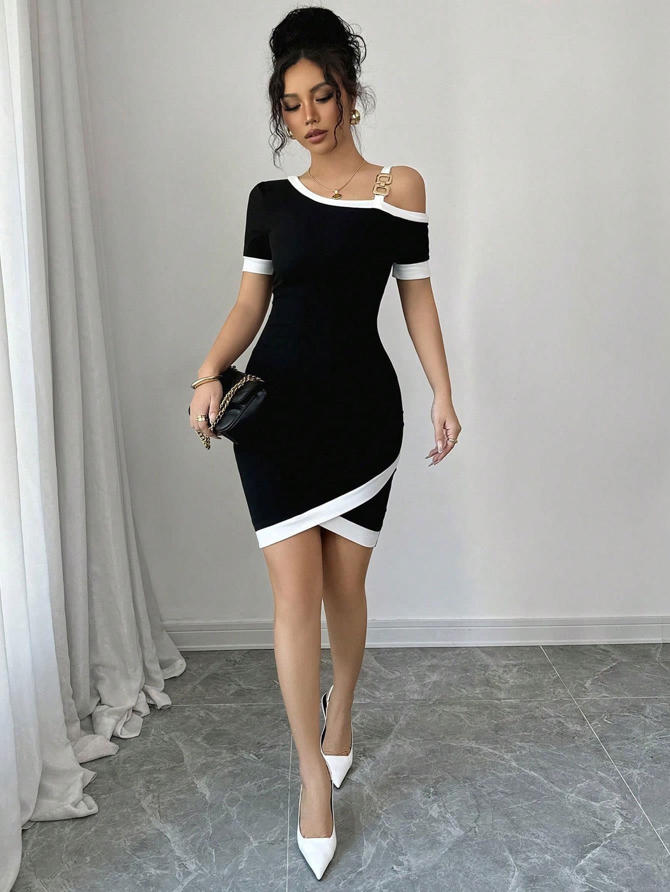• Women's One Shoulder Bodycon Dress Asymmetrical Contrast Piping Mini Dress With Metal Buckle Slim Fit Elegant Party Evening Knit Short Dress