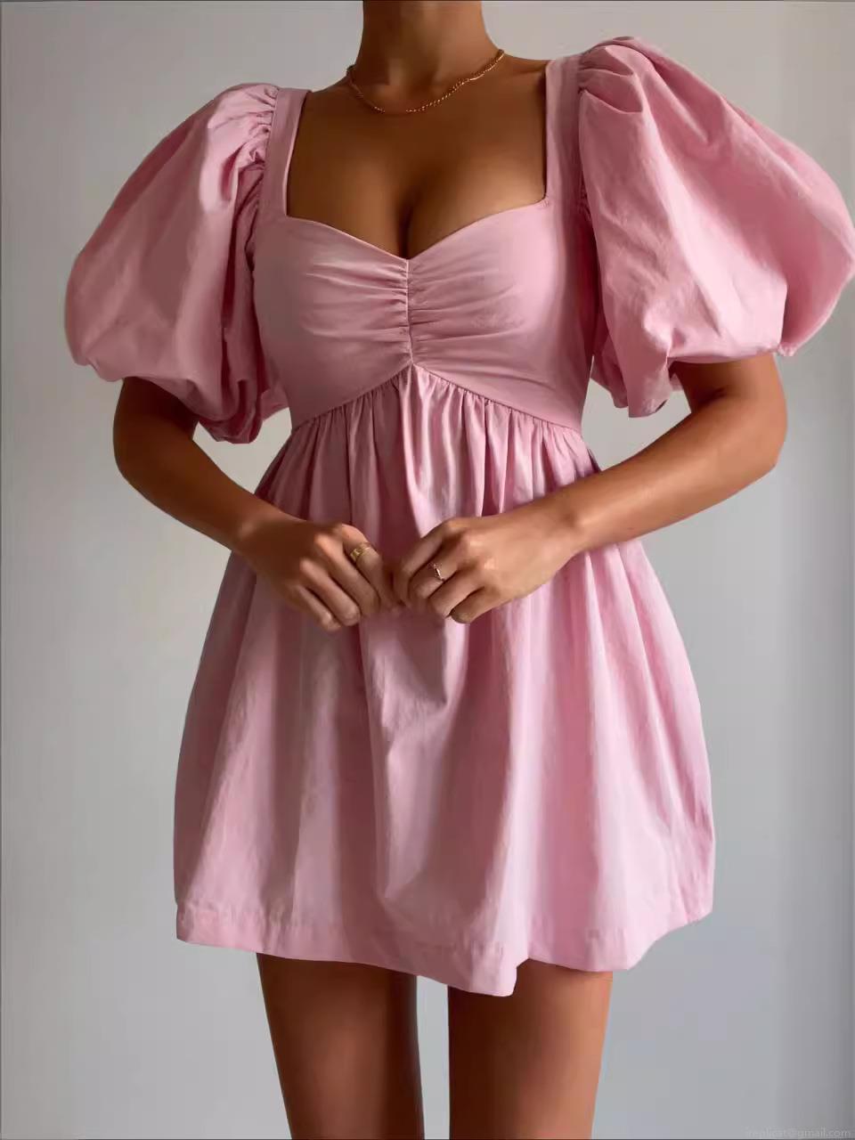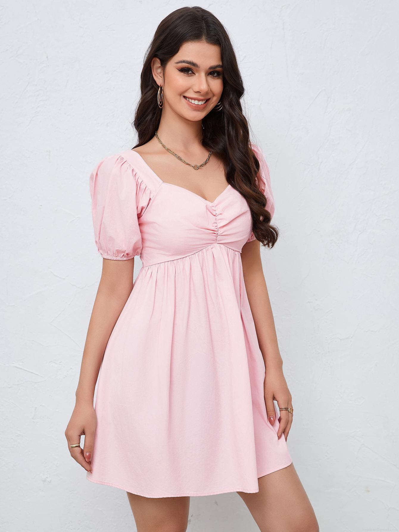 • Women's Pink 100% Cotton Mini Dress Puff Sleeve V-Neck Ruched Bust Slim Fit High Waist A-Line Sexy Summer Casual Party Sundress
