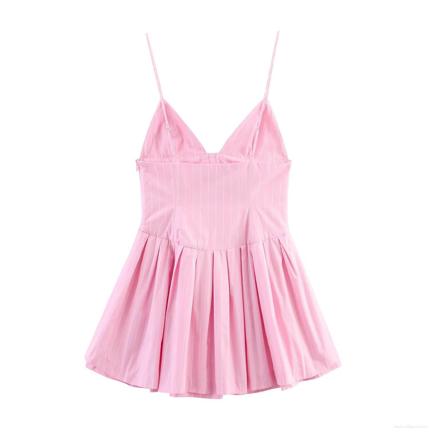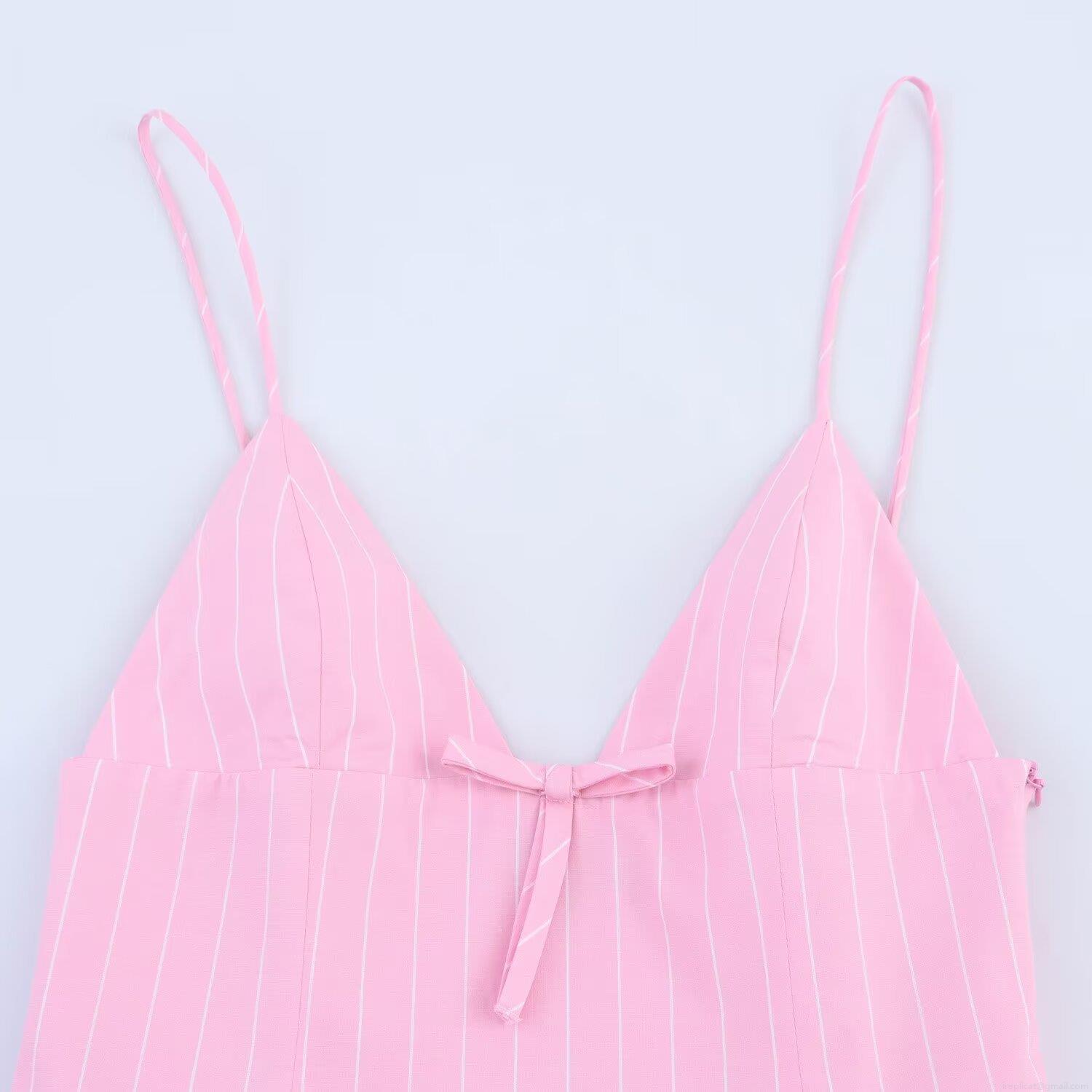 • Women's Pink Striped Bow Decor Sleeveless Mini Dress Elegant V-Neck Cami Pleated Sundress for Summer Beach Party Outfits