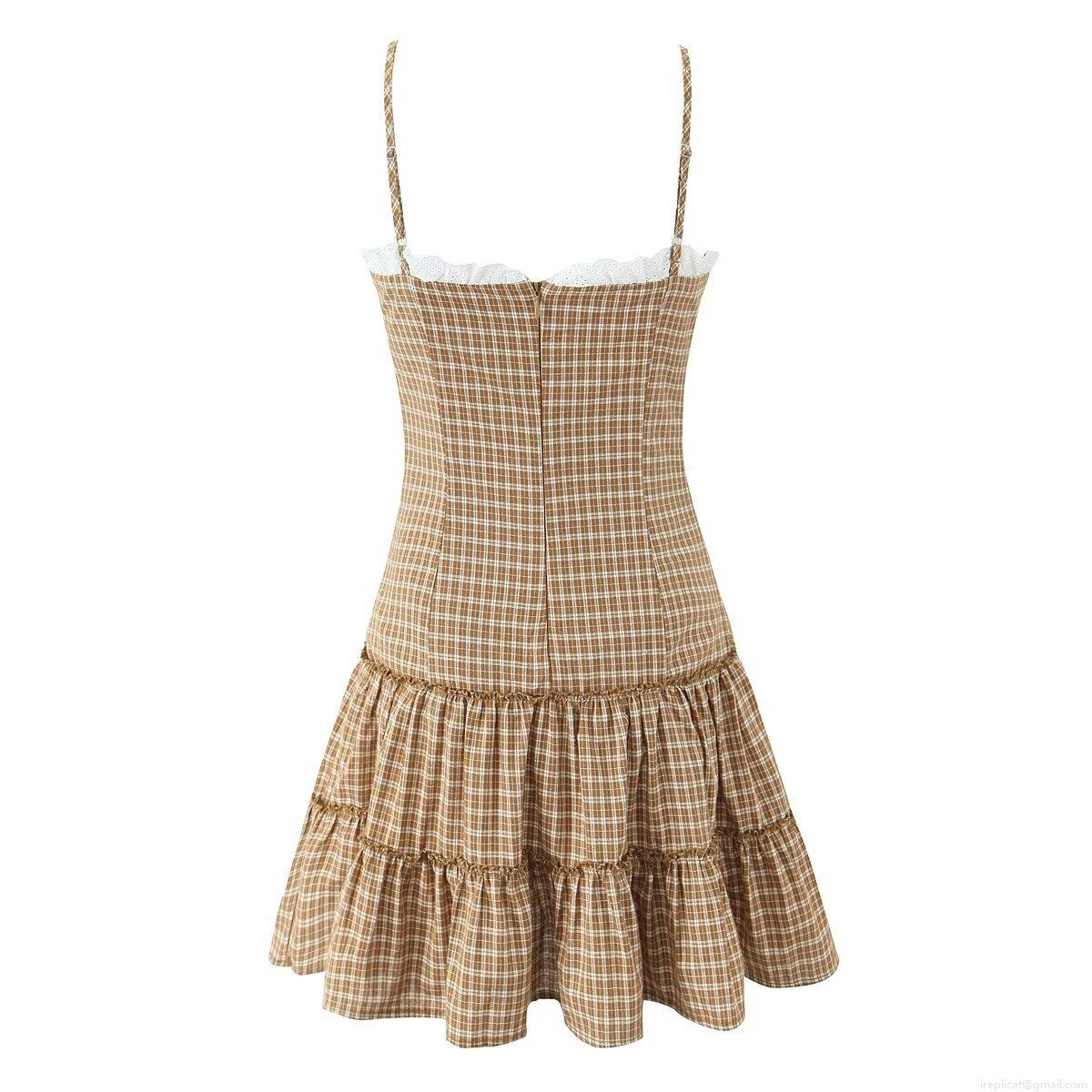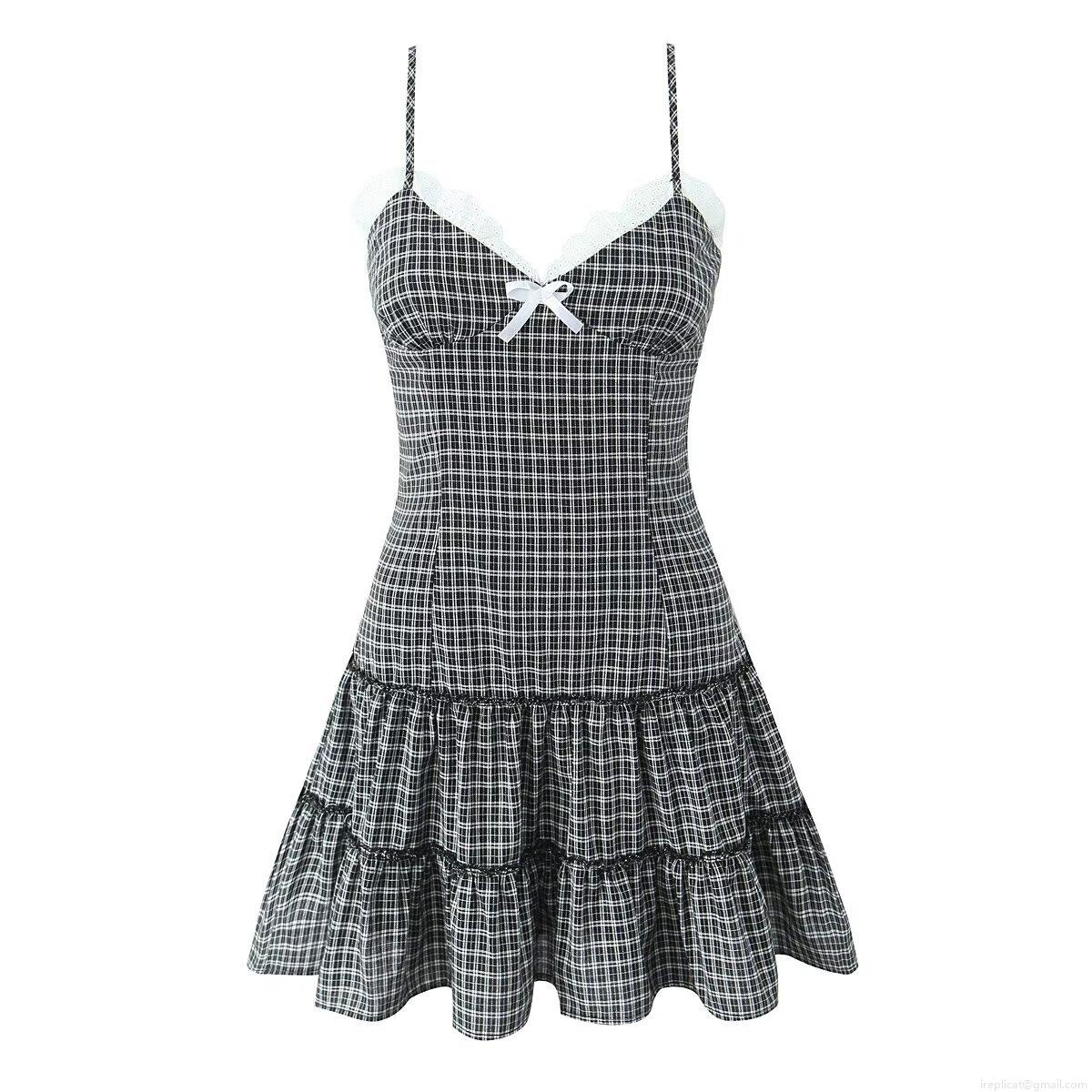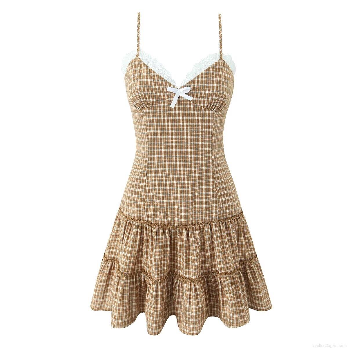 • Women's Plaid Camisole Mini Dress Cotton Blend Lace Trim Bow Decor V-Neck Sleeveless A-Line Layered Cake Skirt Streetwear Daily Dress