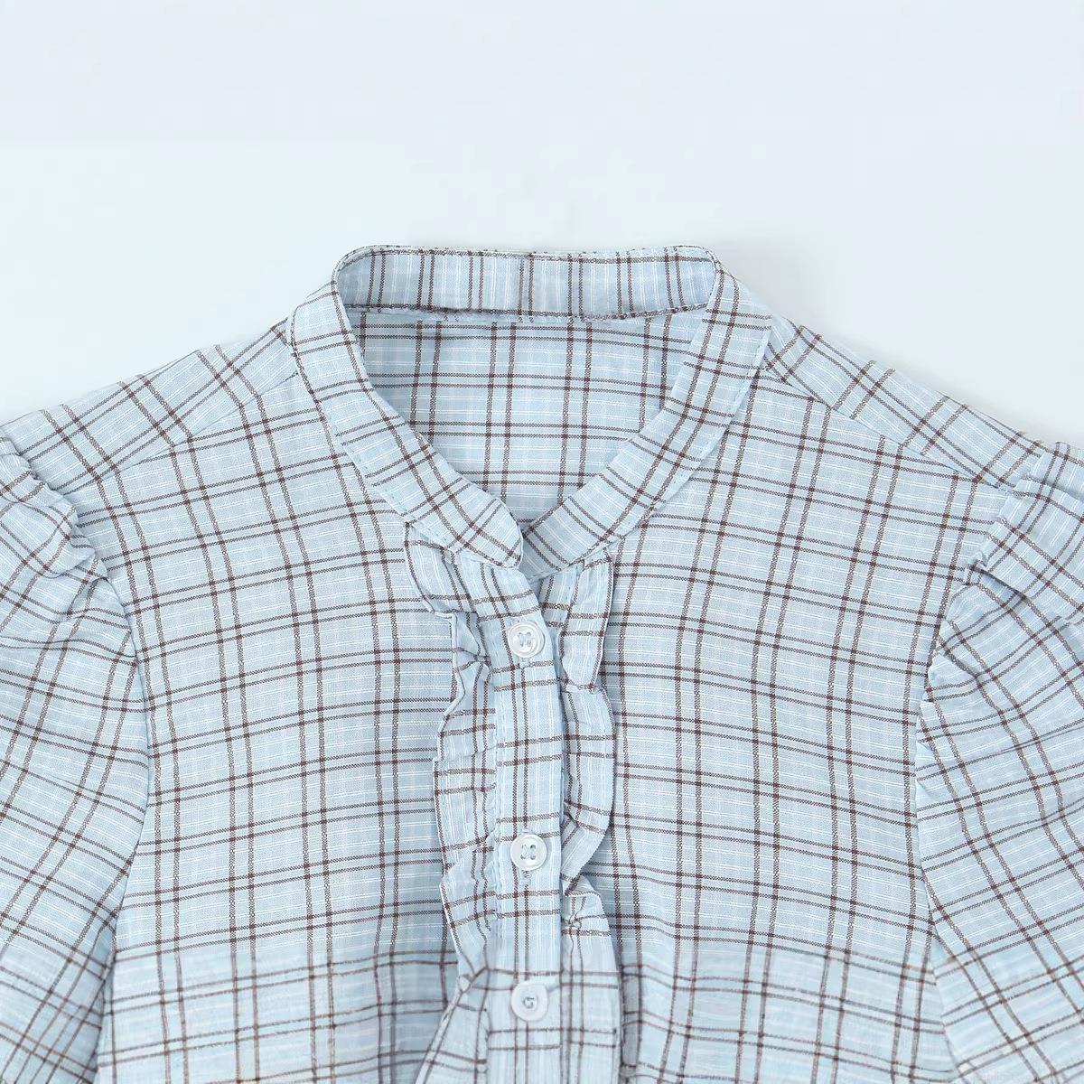Checkered Pattern, Ruffles, Elastic Waistband, Button, Stand-up Collar