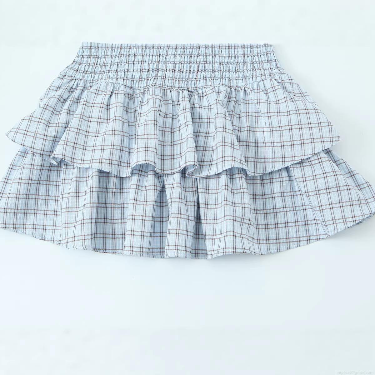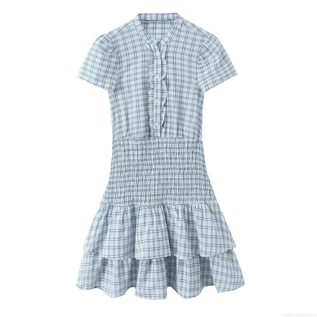• Women's Plaid Short Sleeve Mini Dress Ruffle Layered Hem Stand Collar Elastic High Waist Polyester Blue Brown Check Dress For Summer Daily Fashion