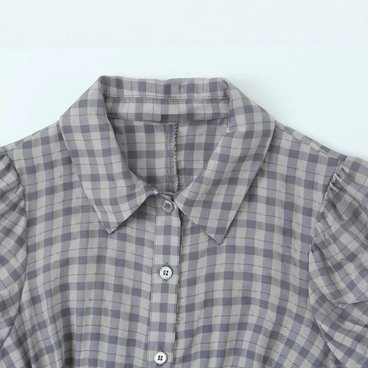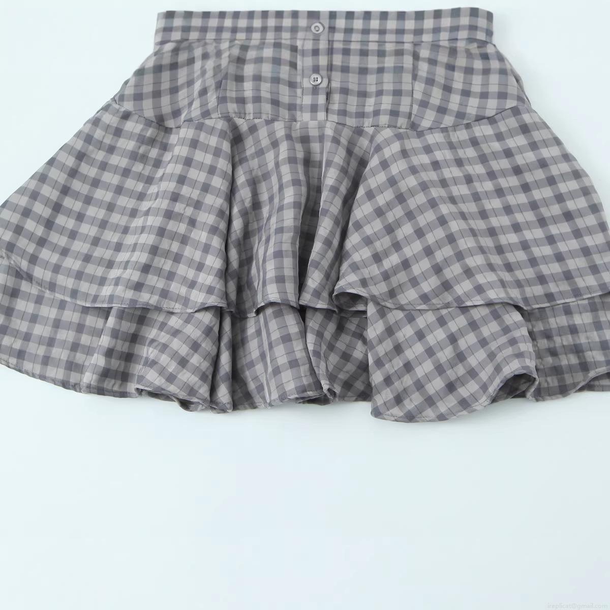 Checkered Pattern, Grid, Puff Sleeves, Single-breasted, Multi-layered Ruffles, Cake Skirt