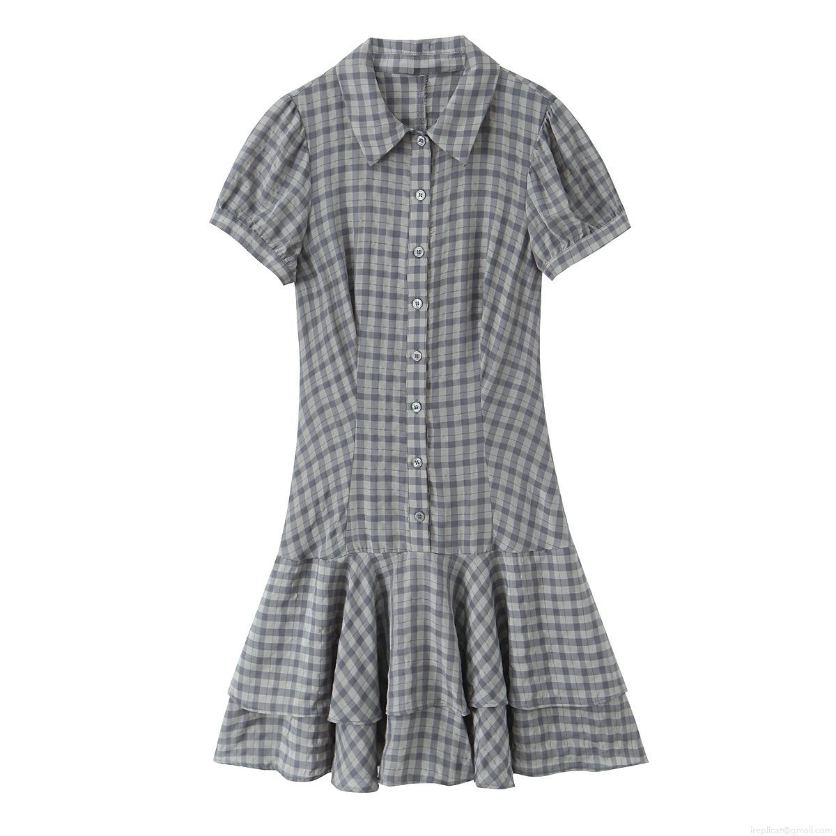• Women's Plaid Tiered Mini Dress Short Sleeve Shirt Collar Button Down Polyester Lolita Style Sweet Summer Casual Dress