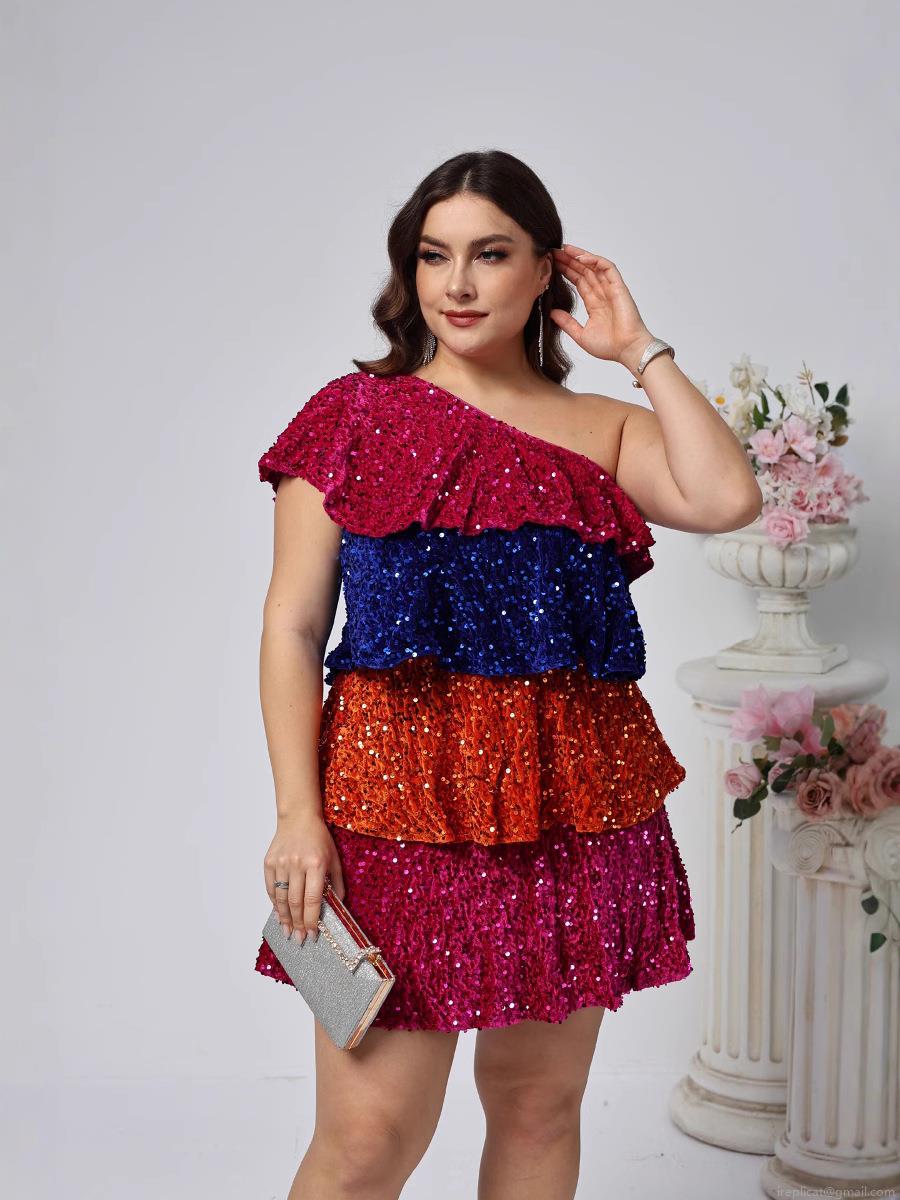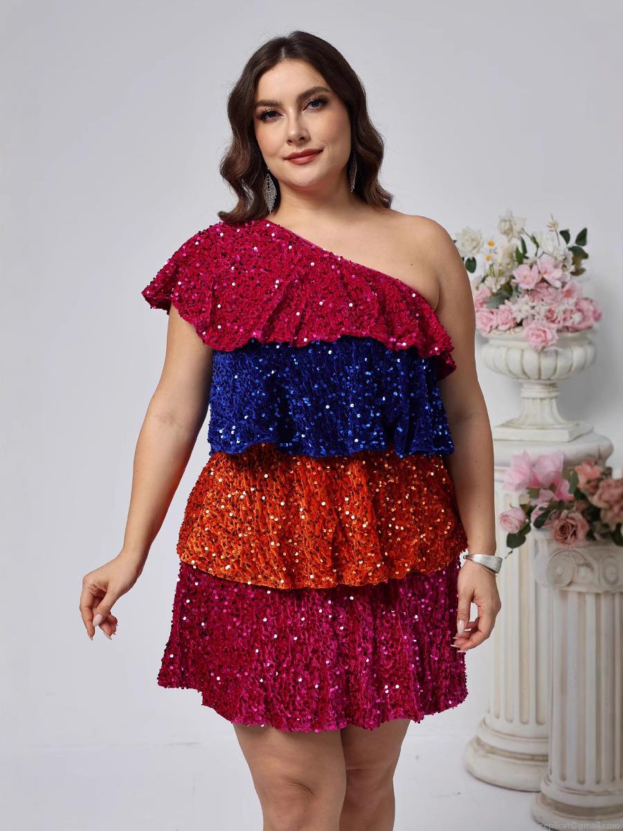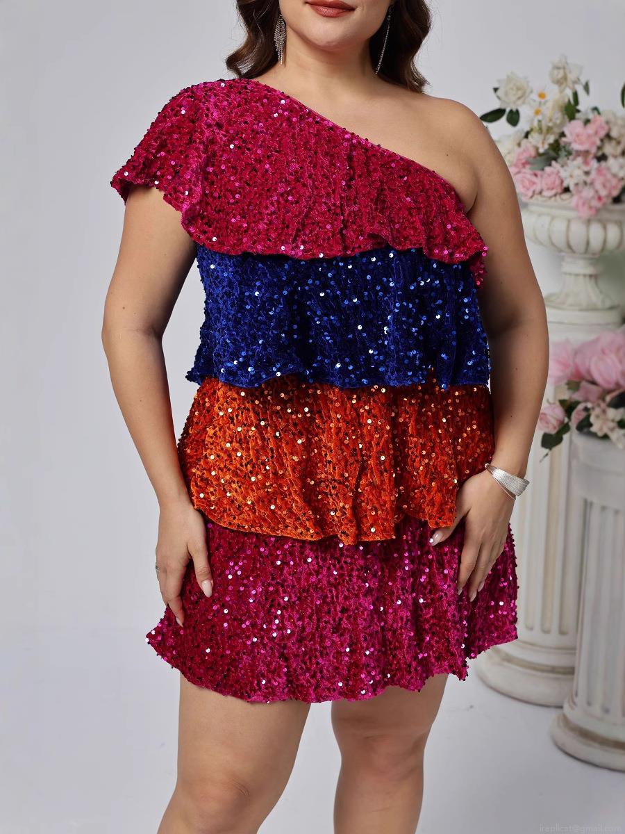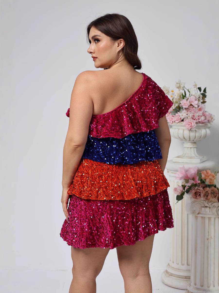 • Women's Plus Size One Shoulder Sequin Mini Dress Tiered Ruffle Multicolor Patchwork Party Evening Gown Birthday Celebration Dress
