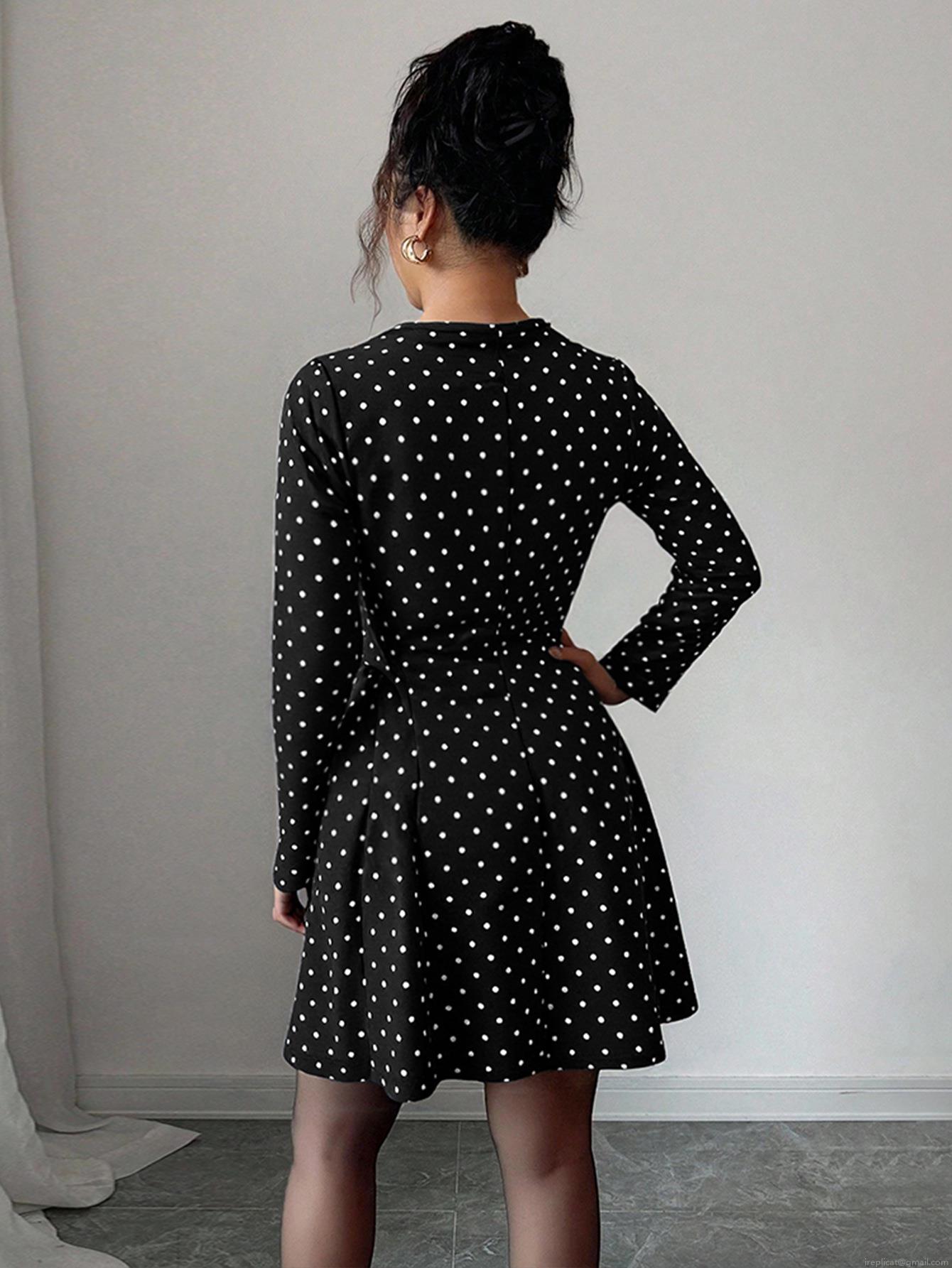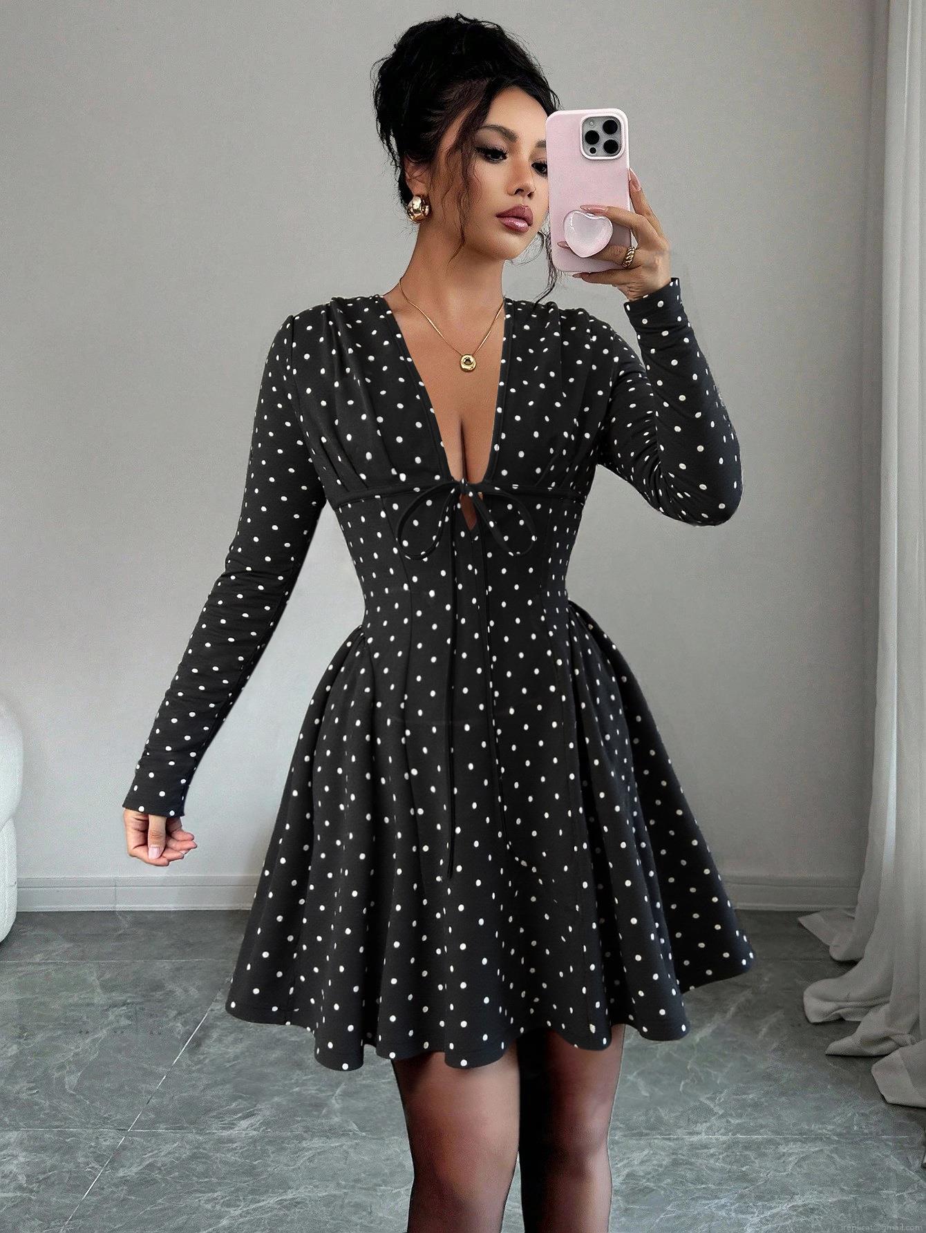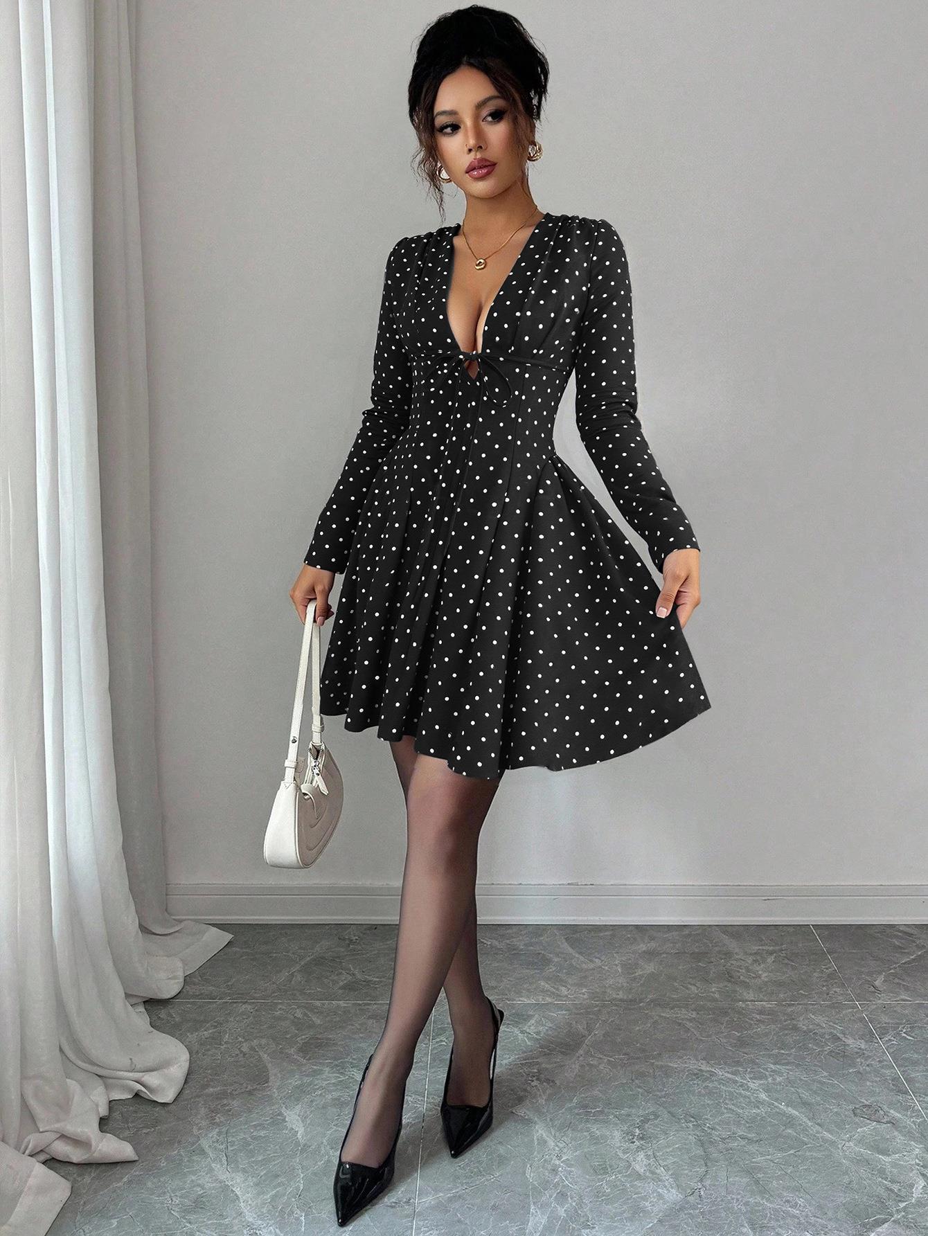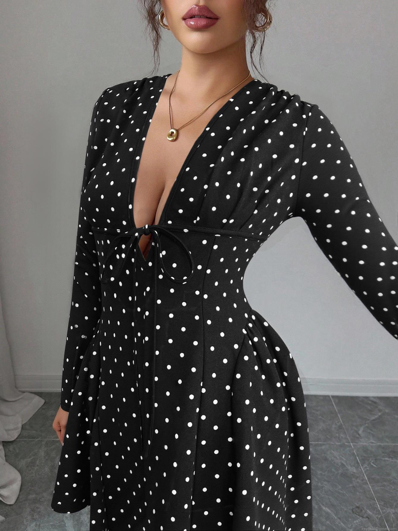 Polka Dots, Waist shaping, Polka Dot Print, Deep V-neck, Chest Tie