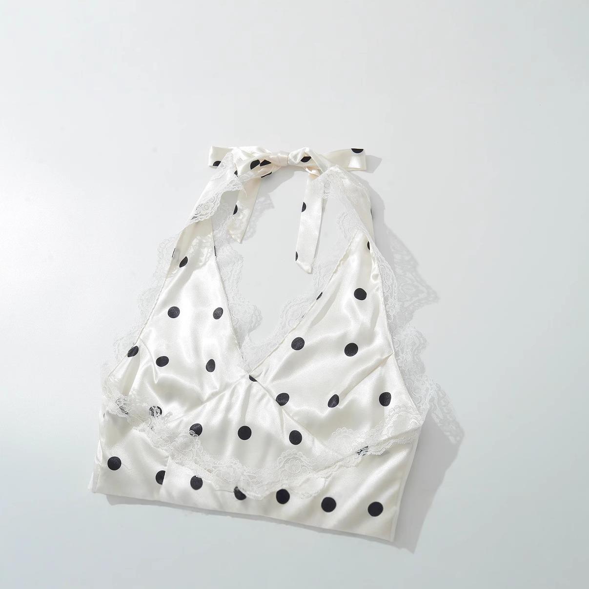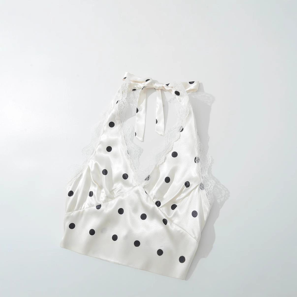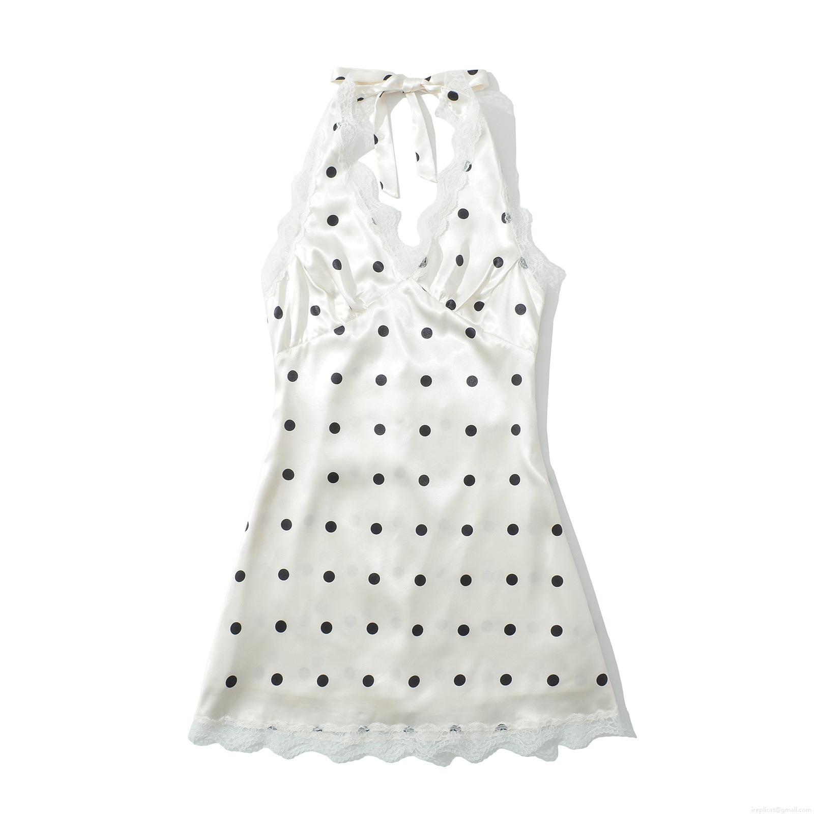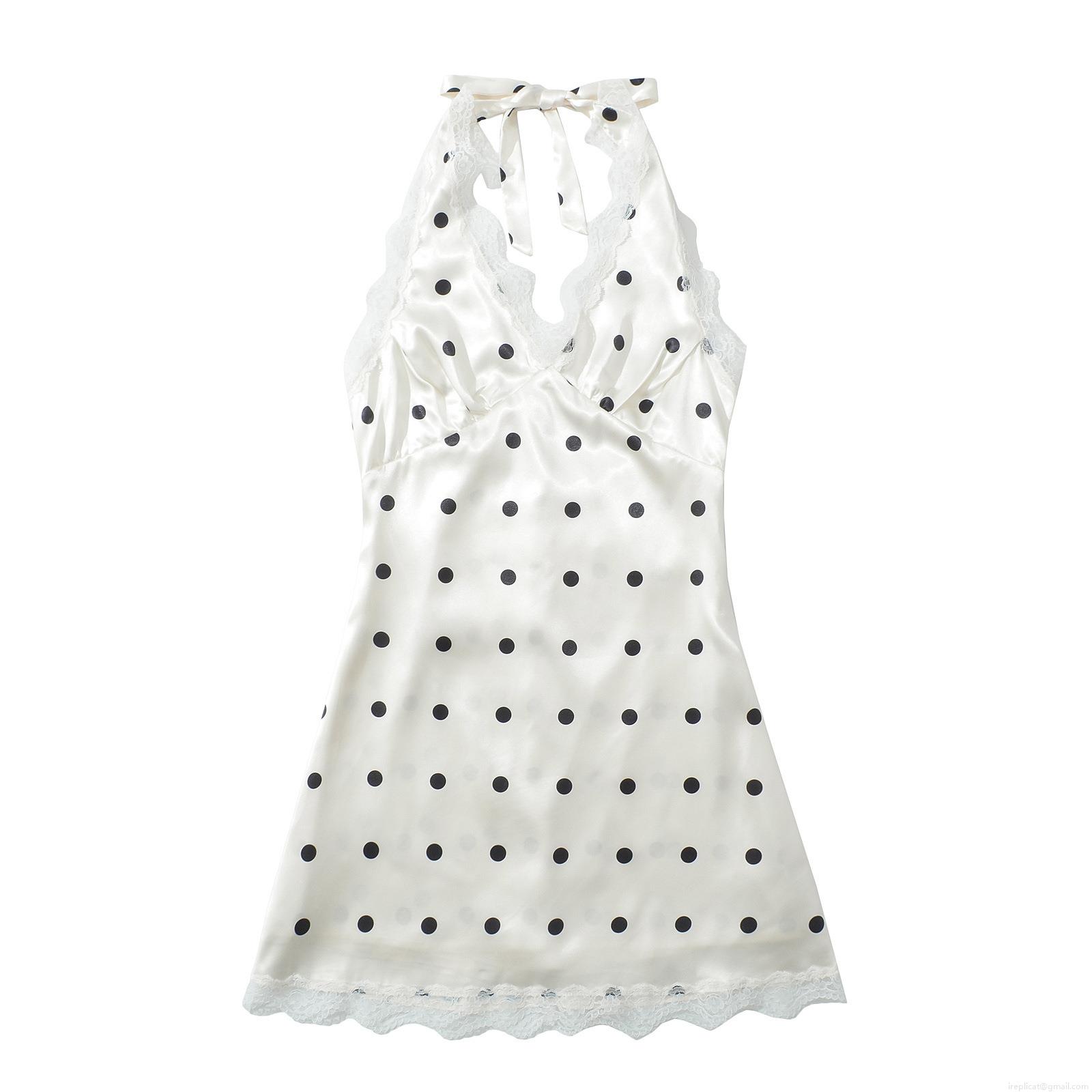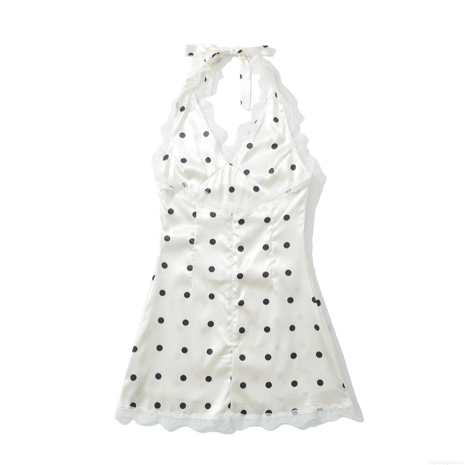 • Women's Polka Dot Satin Dress White Black Halter Neck Lace Trim Patchwork Backless Sexy Summer Mini Dress For Streetwear Party Date Night Fashion Clothing