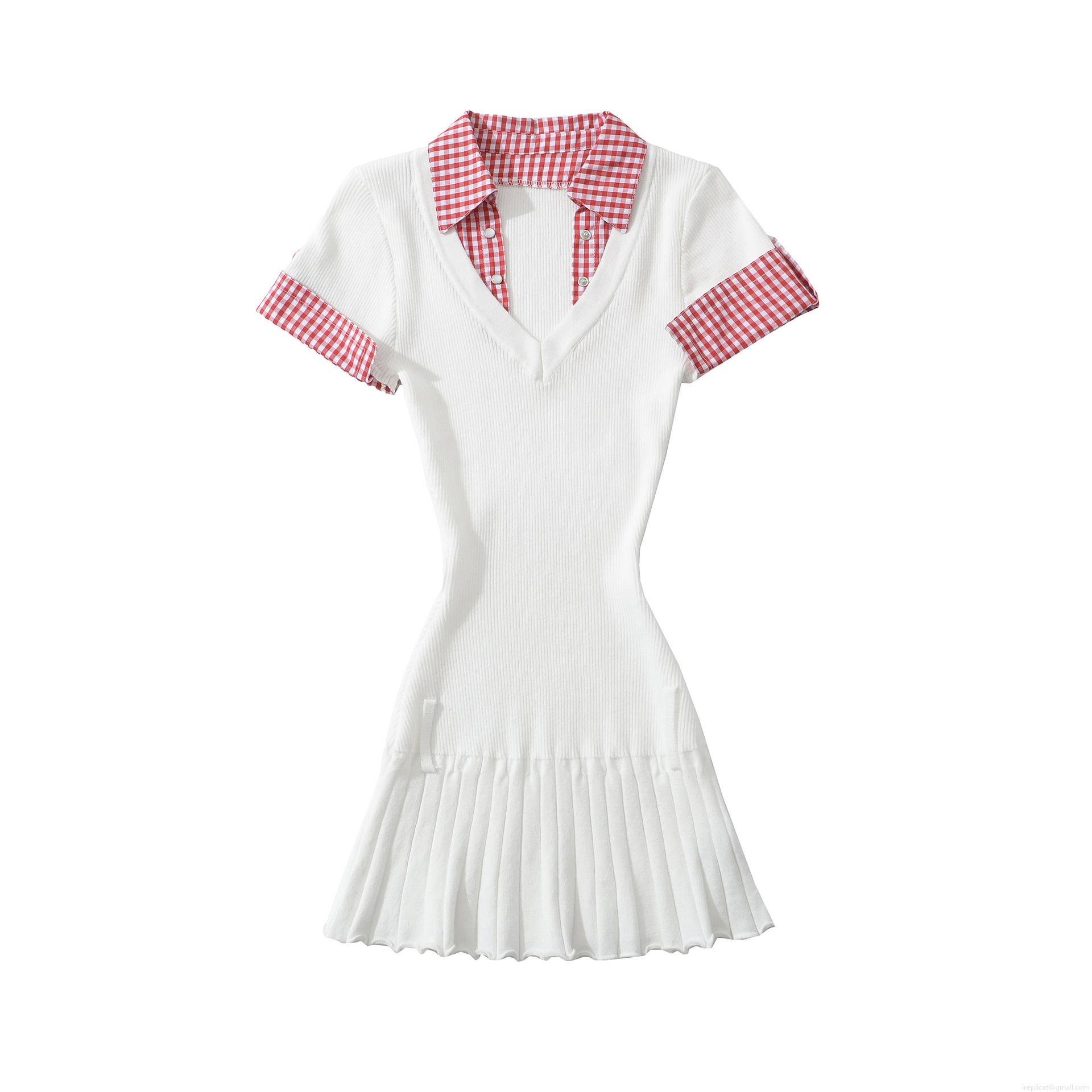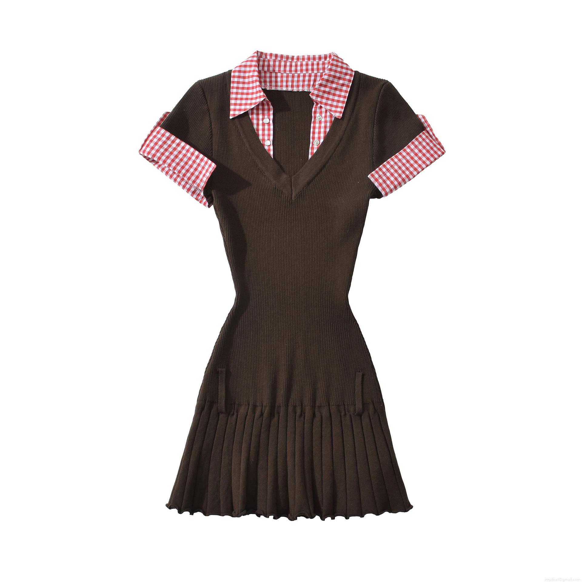 • Women's Preppy Ribbed Knit Mini Dress Gingham Patchwork V Neck Short Sleeve Slim Fit Pleated Hem Bodycon Summer Casual Dress