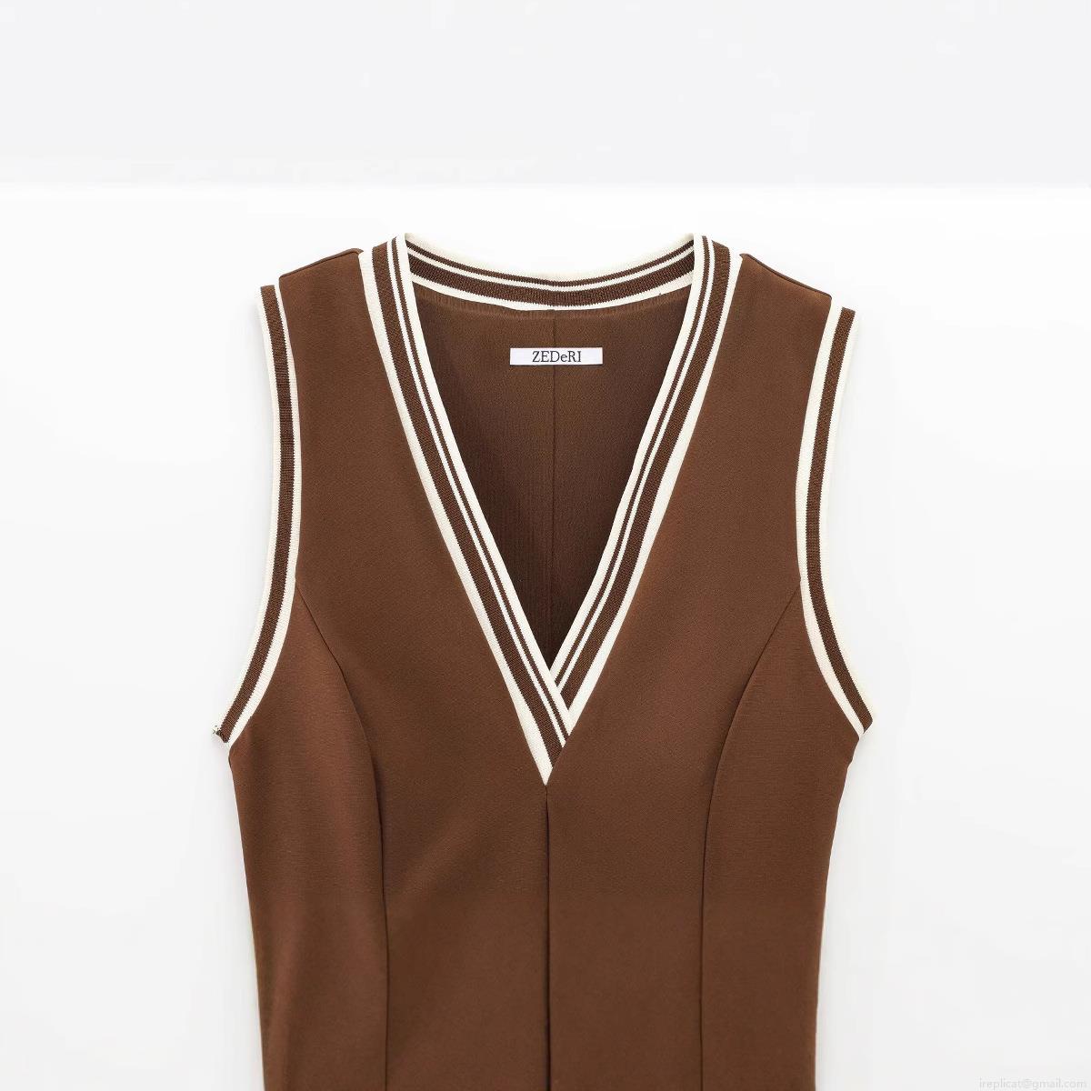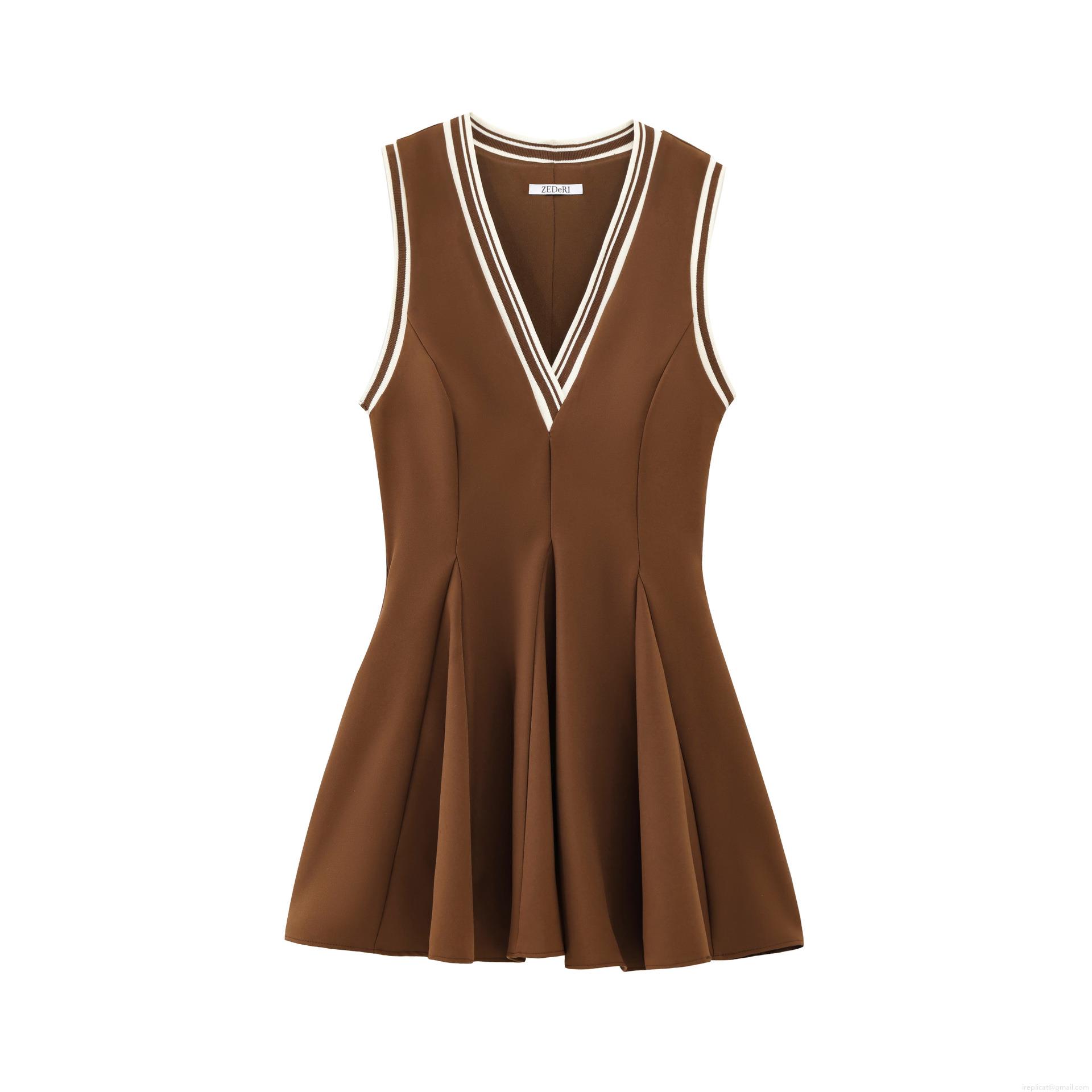 • Women's Preppy Style Sleeveless V-Neck Mini Dress Triacetate Fiber Blend Striped Trim Pleated Skirt Casual Summer Fashion Pullover Chic Outfit