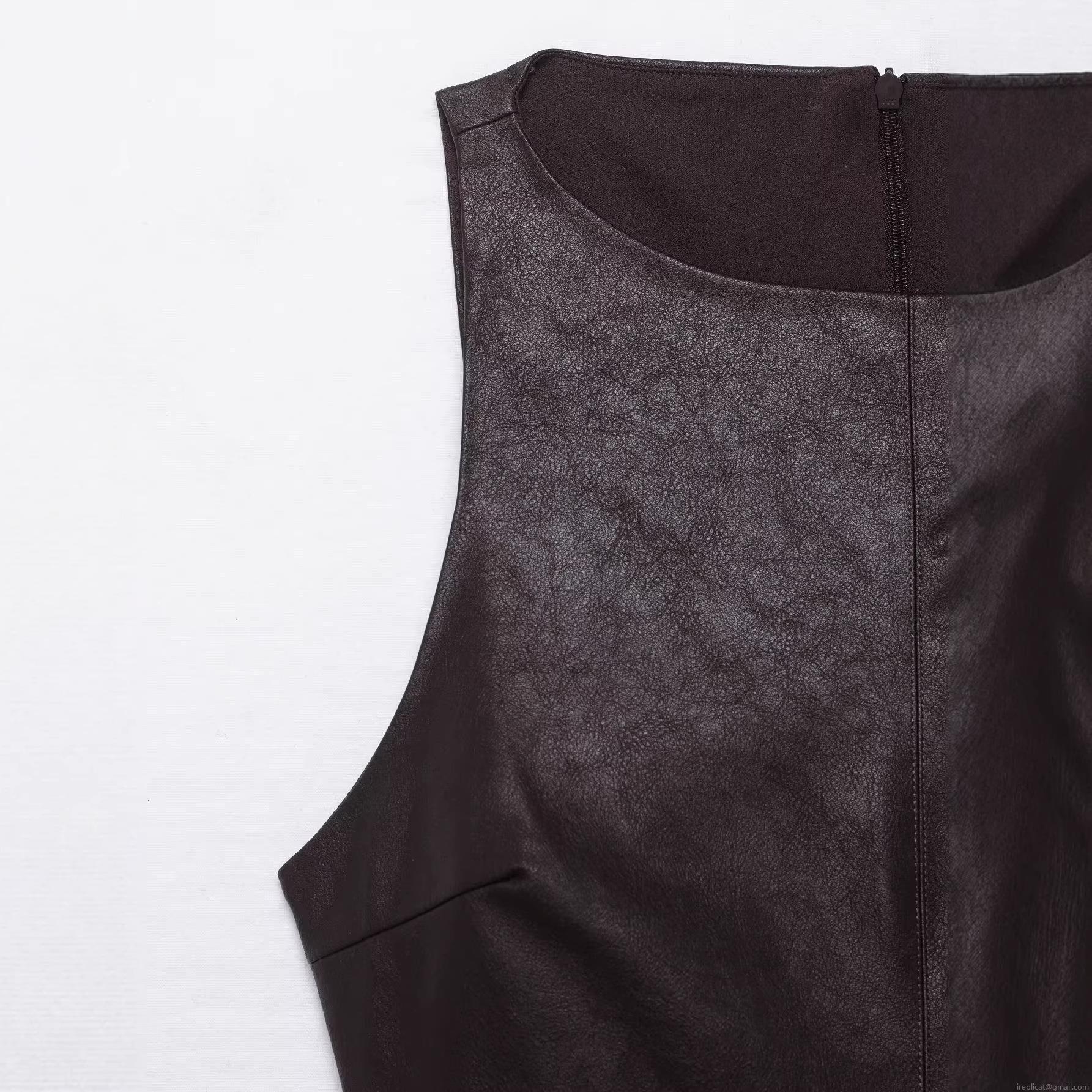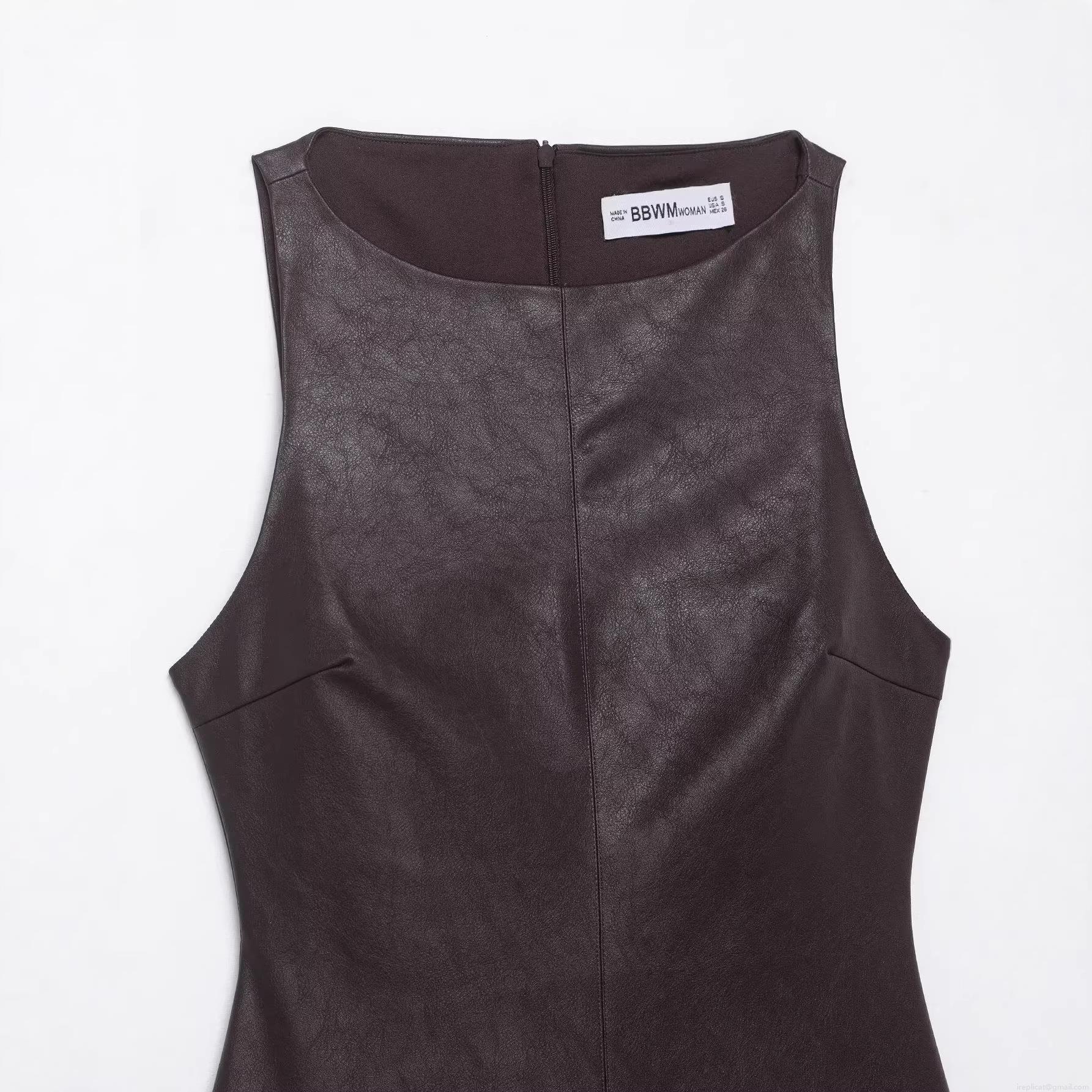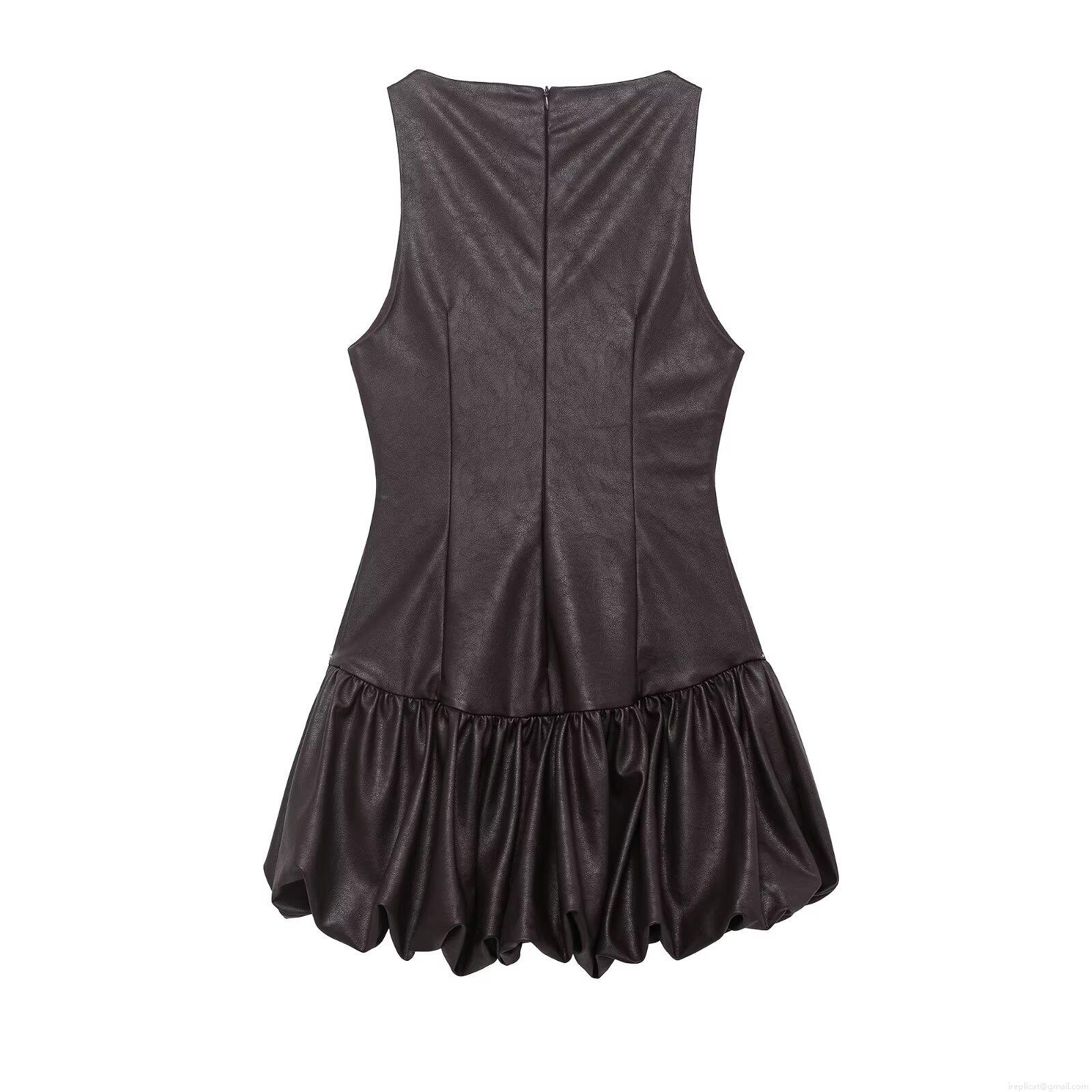 • Women's PU Leather Mini Dress Sleeveless Crew Neck Back Zipper Pleated Puff Hem Slim Fit Faux Leather Party Streetwear Short Dress