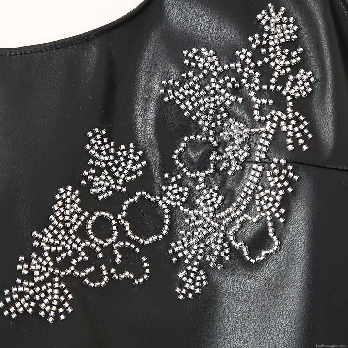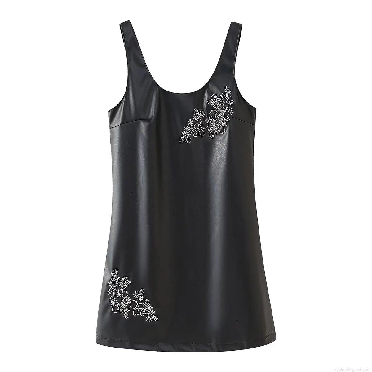 • Women's Retro Black PU Leather Mini Dress Elegant Silver Beaded Flower Sleeveless Spaghetti Strap Party Dress Chic A-Line Clubwear Dress