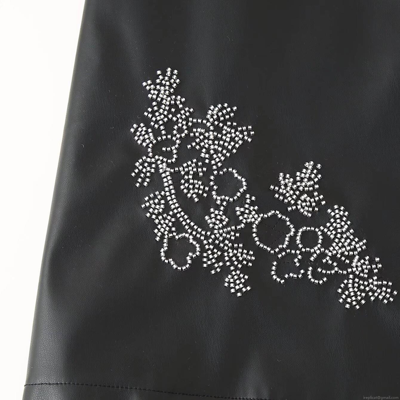Women's Retro Black PU Leather Mini Dress Elegant Silver Beaded Flower Sleeveless Spaghetti Strap Party Dress Chic A-Line Clubwear Dress