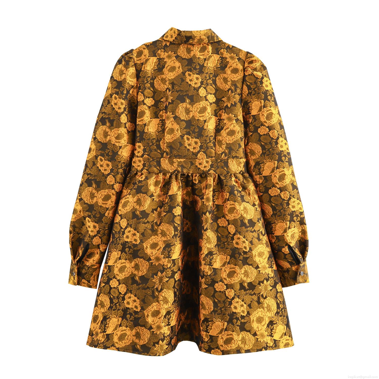 • Women's Retro Court Style Jacquard Floral Long Sleeve Mini Dress Elegant Lapel Button Down High Waist Pleated A-Line Party Dress
