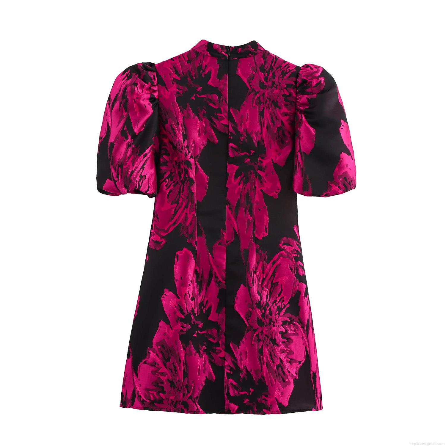 • Women's Retro Elegant Jacquard Floral Dress Standing Collar Puff Sleeve A-Line Mini Dress Back Zipper Polyester Satin Cocktail Party Short Dress