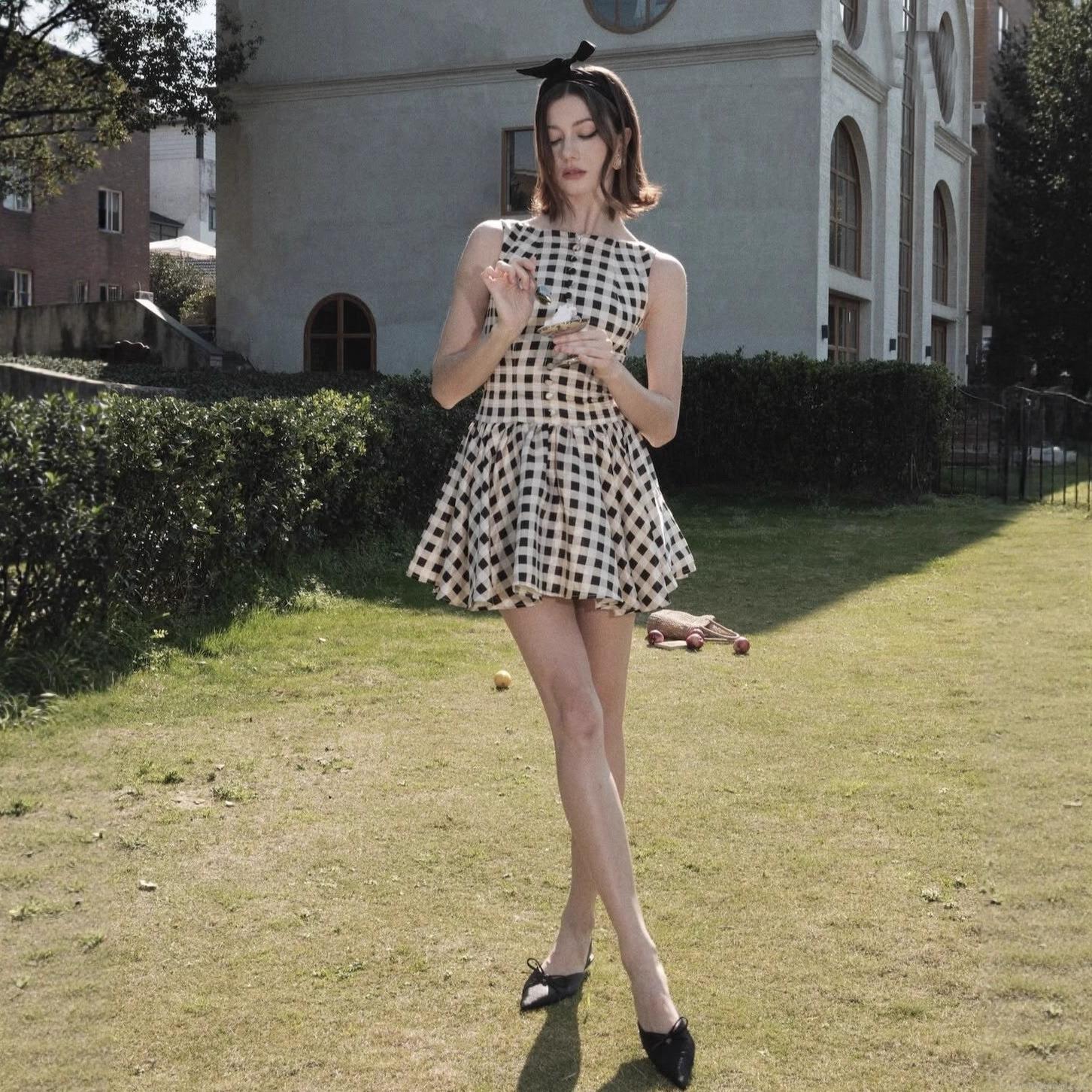 • Women's Retro Gingham Plaid Sleeveless Mini Dress Polyester Pleated A-Line Sweet Style Button Decorative Summer Dress for Daily Vacation