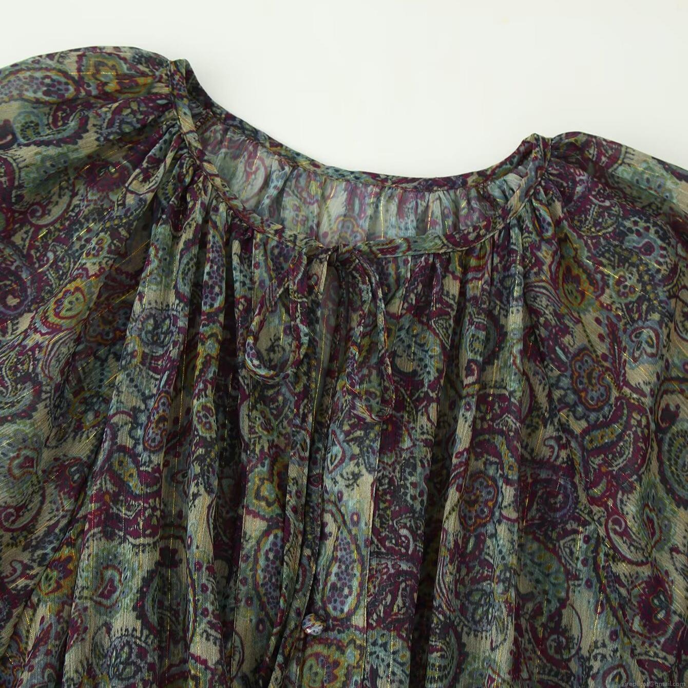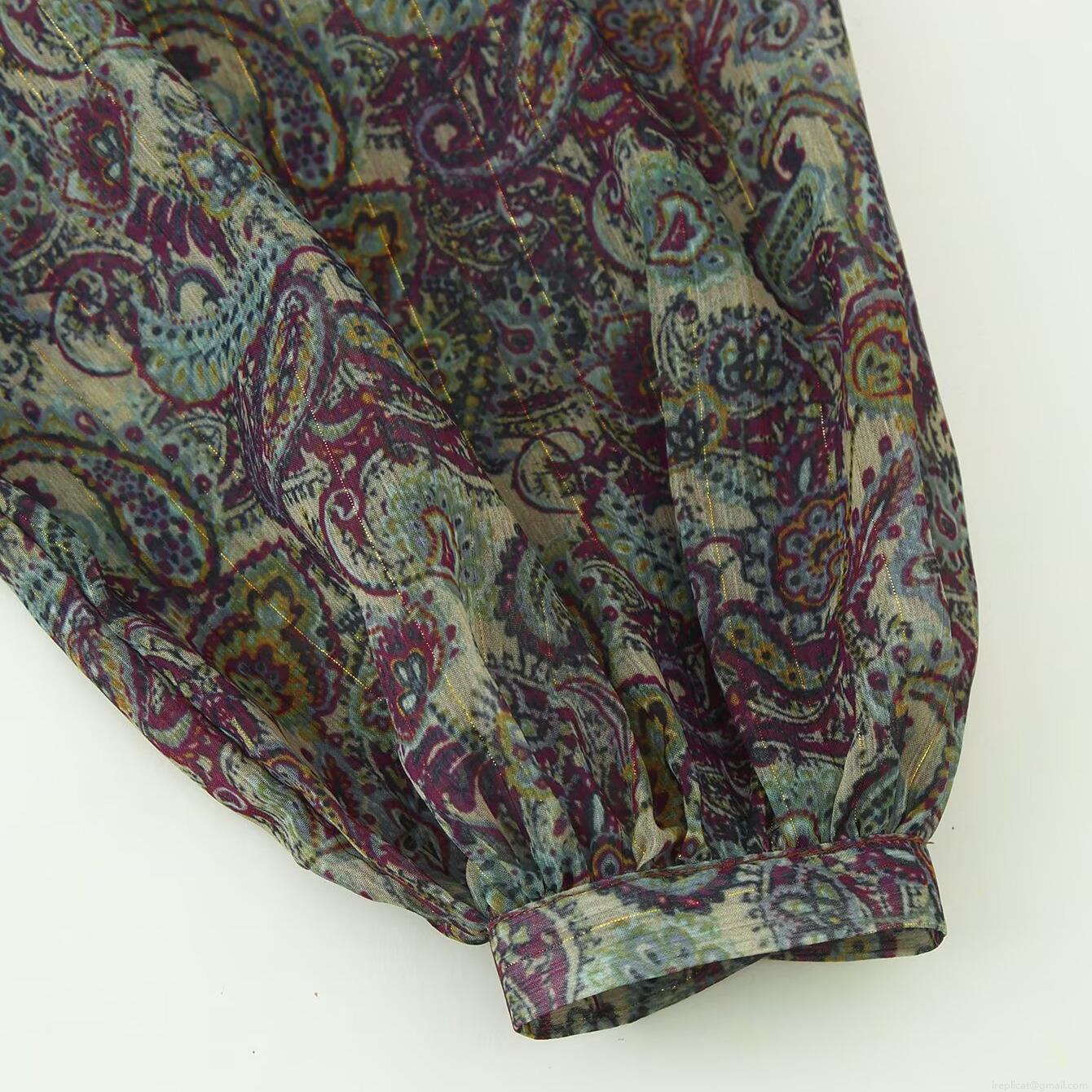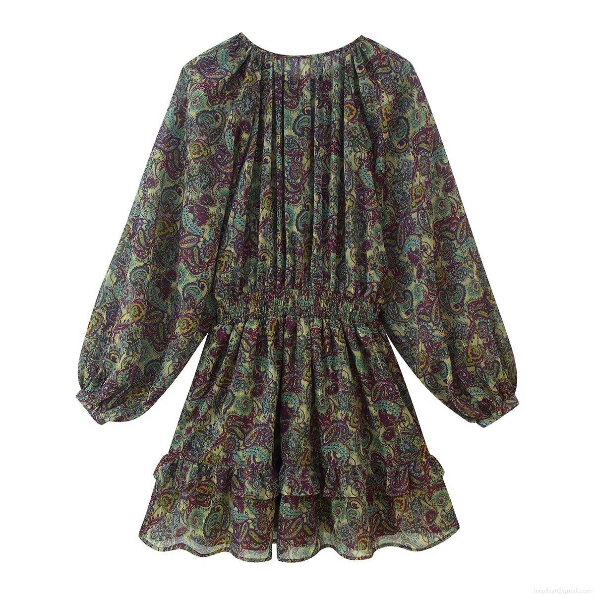 • Women's Retro Paisley Print Chiffon Mini Dress With Metallic Thread Long Sleeve Elastic Waist Ruffle Hem Boho Short Dress