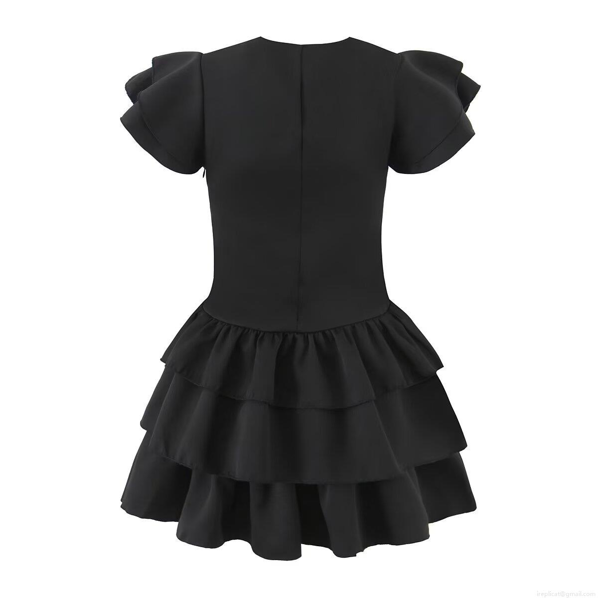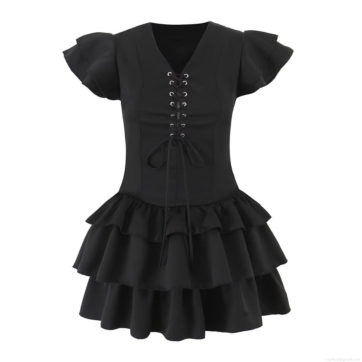 • Women's Retro Sexy V Neck Lace Up Ruffle Short Sleeve Tiered Cake Mini Dress Polyester Spandex Solid Color Party Clubwear Gothic Sweet Dress