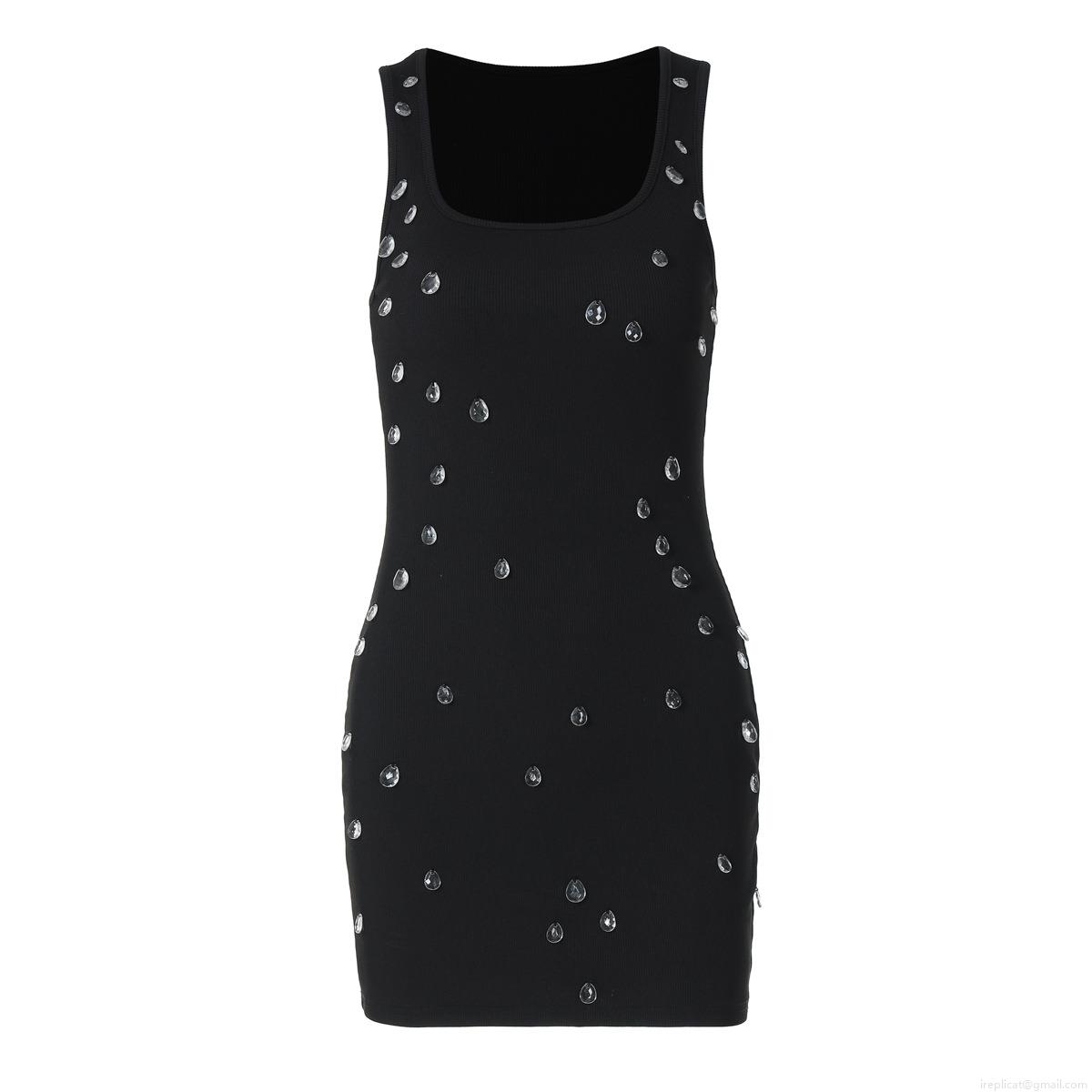 Women's Ribbed Bodycon Mini Dress Sexy Sleeveless U-Neck Rhinestone Beaded Summer Party Club Slim Fit Knitted Tank Dress